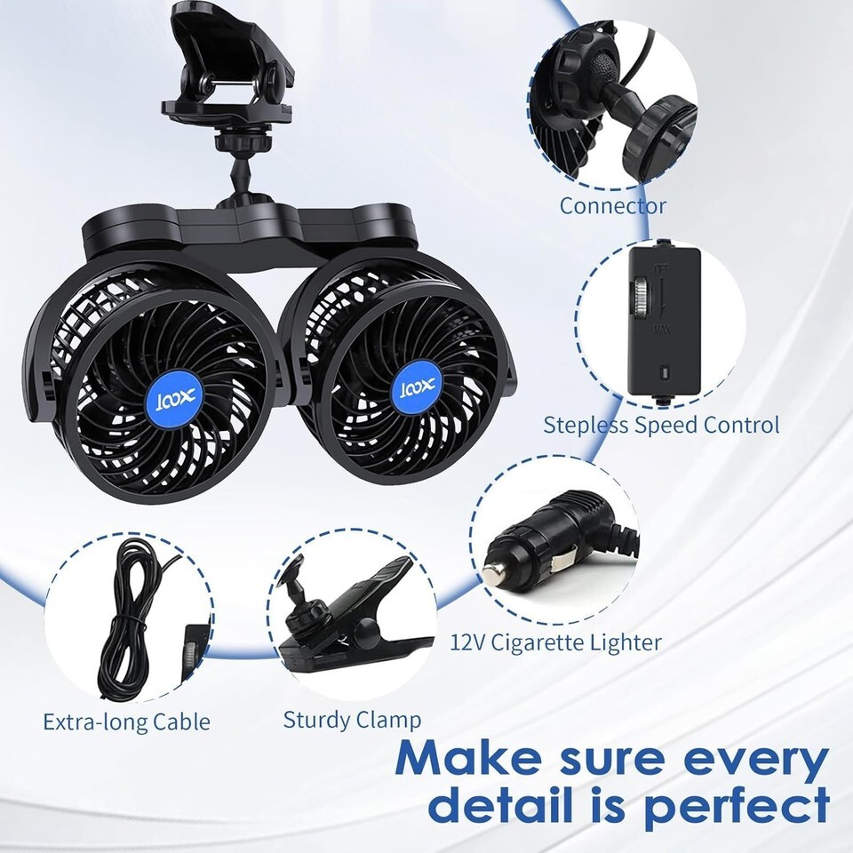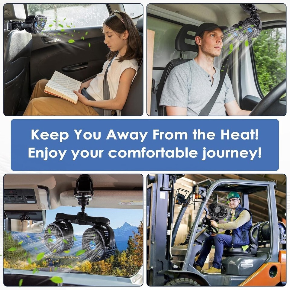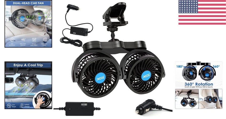 - Adjustable 4-Inch Clip Car Fan - Dual Head 360° Rotatable Cooling Solution