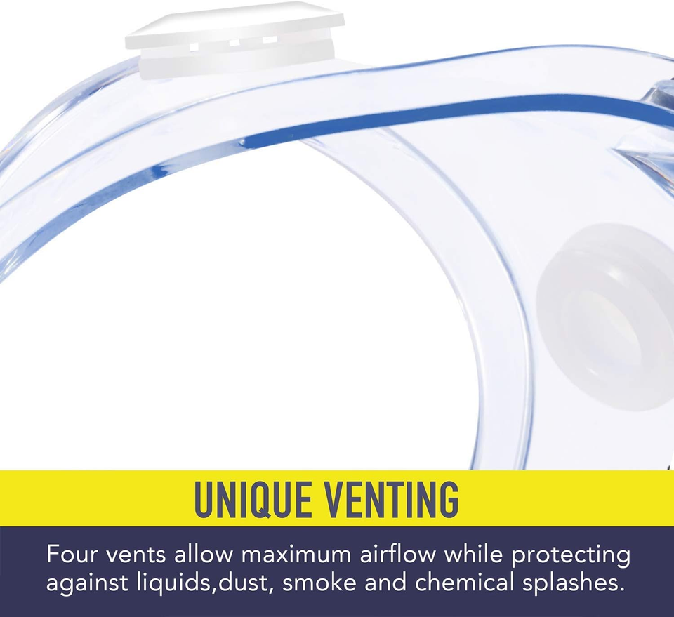 Unique Venting - Featuring four strategically placed vents, these goggles allow for optimal airflow while effectively protecting against liquids, airborne particulates, and chemical splashes.