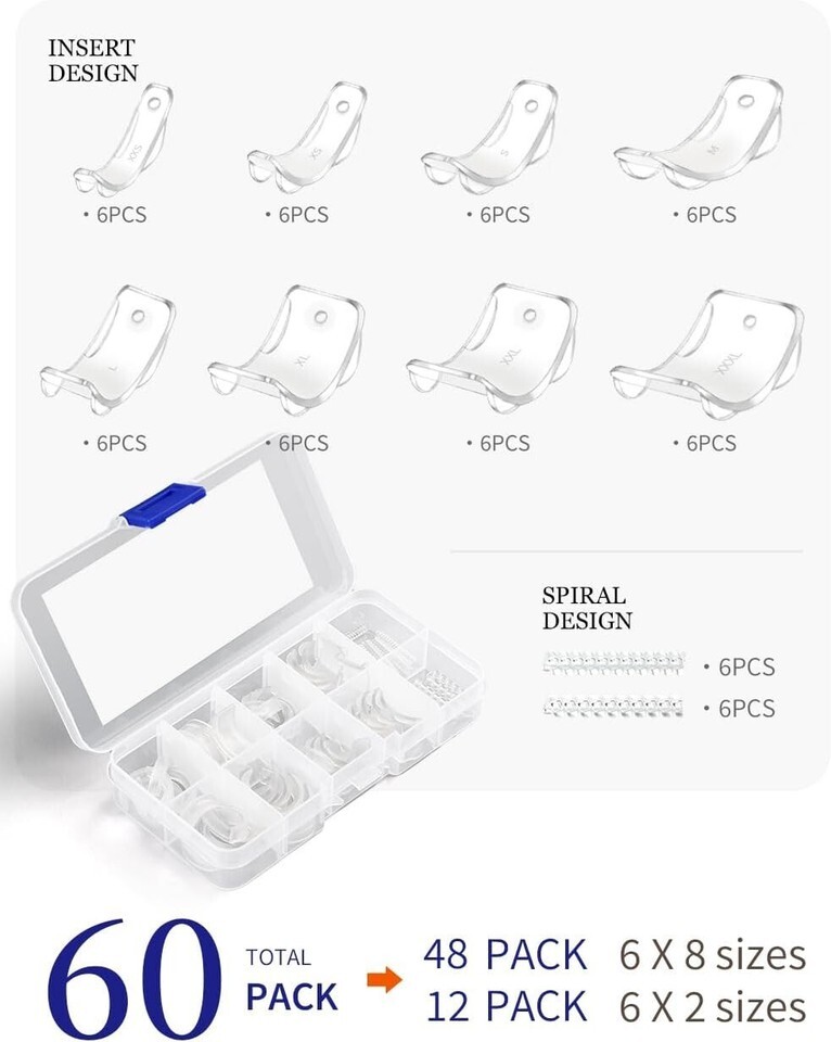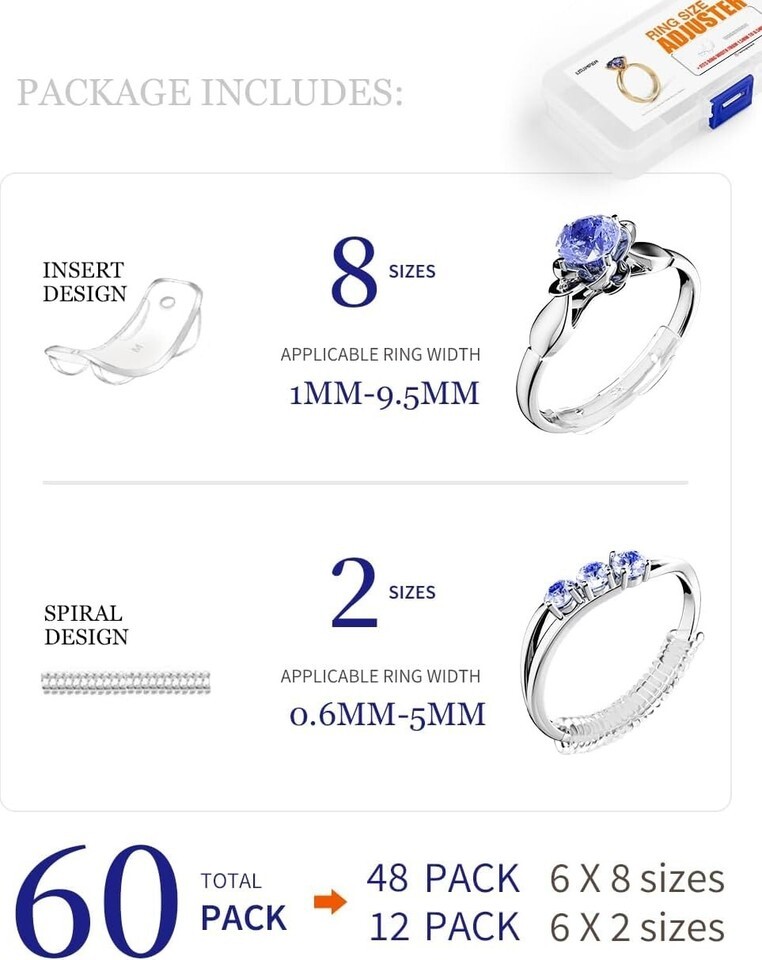 Complete Package: Includes 12pcs ring size adjusters (spiral design), 48pcs ring adjuster pads (insert design), and a convenient Ring Adjuster Organizer.