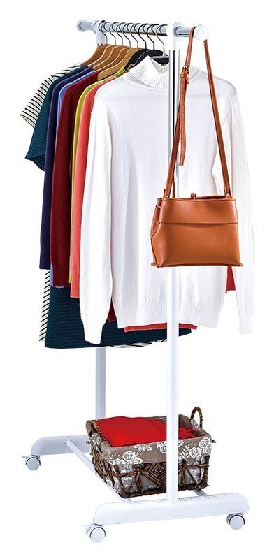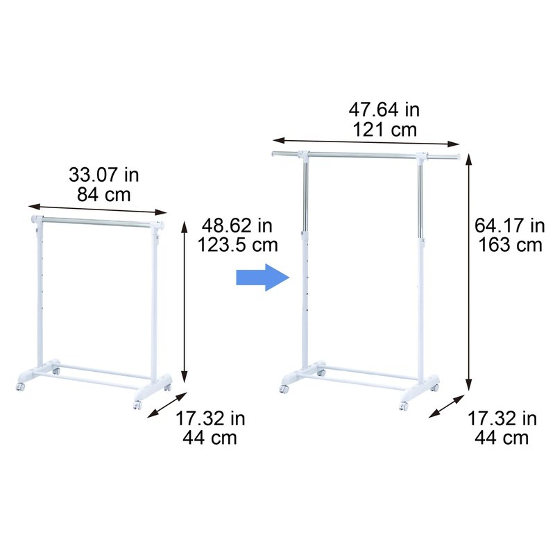 Mainstays Adjustable Rolling Garment Rack, White Assembled Product Size:33.07-47.64W x 17.32D x 48.62-64.17H inch/84-121W x 44D x 123.5-163Hcm Assembled Product Weight: 2.30kgs/5.06lbs. Height expands to customize depending on your specific storage needs. A chrome and white color for a sleek appearance sure to complement any aesthetic Innovative space saving design that maximizes your unused space to give you an out of the way place to hang those extra garments. This adjustable rolling garment rack requires no tools meaning installation is a breeze. Includes a bottom rack that can be used for shoe or accessory storage to create a home for everything. Innovative space-saving design that maximizes your unused space in any room.