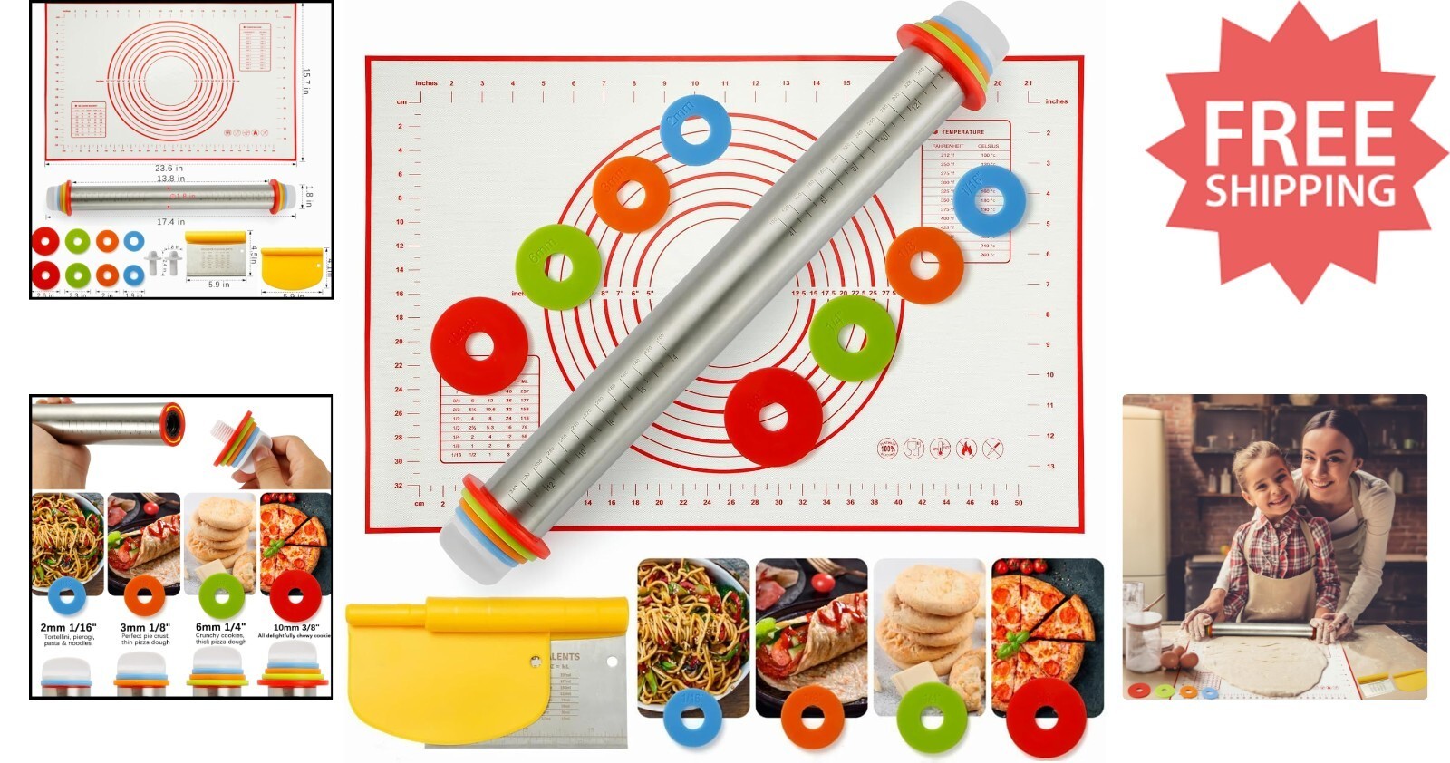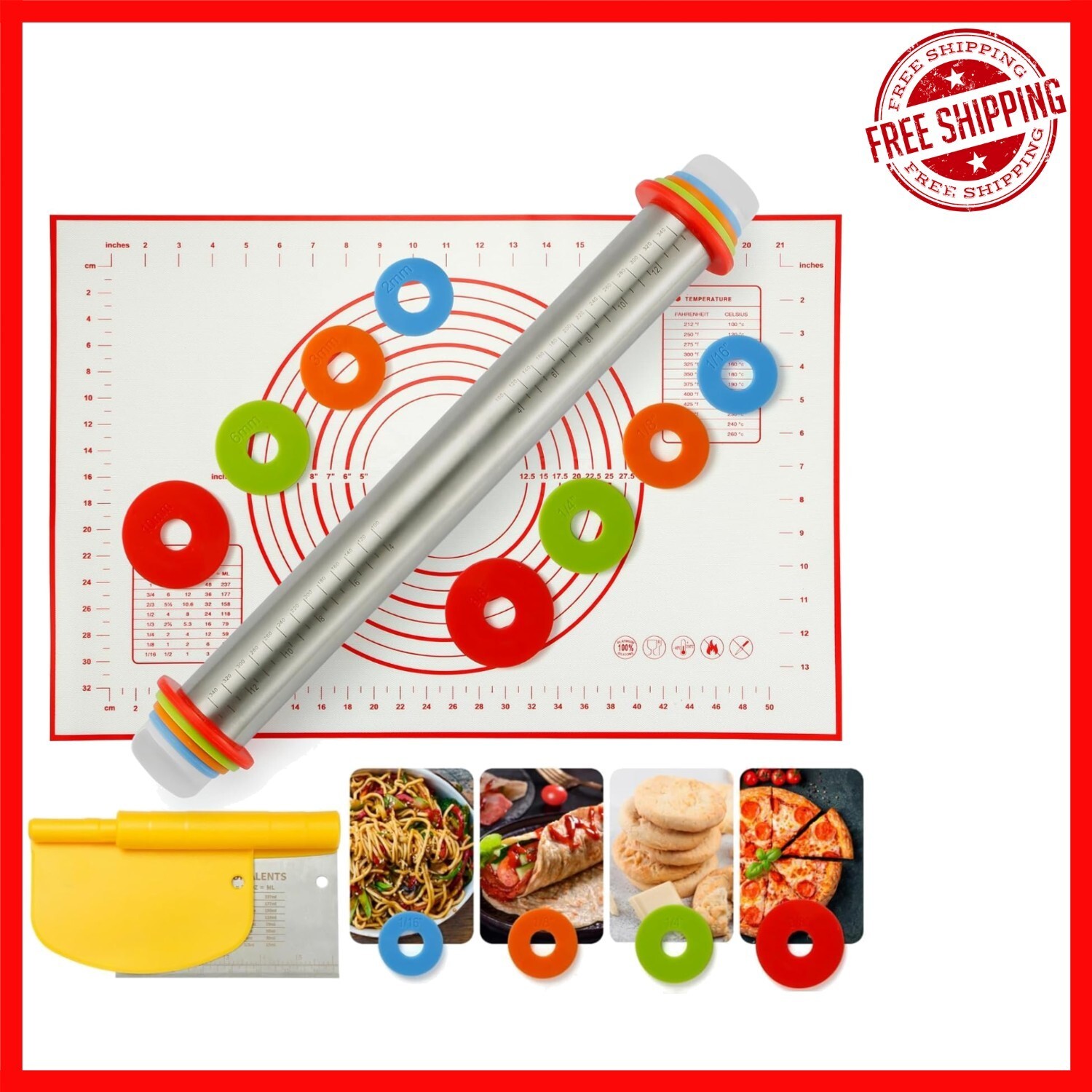 Adjustable Rolling Pin Silicone Baking Mat Set for Perfect Pastry Results ? ? ? ? ? ? ? ? ? ? ? ? ? ? ? ? Discover the ultimate baking set crafted from high-quality, food-grade materials including 304 stainless steel, silicone, and durable plastic. This comprehensive combo features a 17.4" dough roller pin, a large 24" x 16" silicone pastry baking mat, and a versatile 2-in-1 dough scraper and pizza cutter?designed to streamline your baking experience. The adjustable rolling pin with four detachable rings allows precise dough thickness control, perfect for pies, bread, cookies, and more. The silicone pastry mat, made of silicone and glass fiber, is non-stick, easy to clean, flexible, and foldable for convenient storage. Meanwhile, the multifunctional dough scraper and pizza cutter help you clean, cut, and decorate with ease. Ideal for both beginners and professional bakers, this set saves you at least $20 and valuable time, turning baking into a joyful activity. Crafted for lifelong use and versatility, it makes a thoughtful gift for any baking enthusiast. To ensure fast and reliable delivery, we work with multiple fulfillment partners and suppliers. Depending on availability and location, your order may ship from different warehouses or arrive in packaging that varies from item to item. Tracking details are typically provided shortly after shipment, and customer satisfaction remains our top priority. Please note that due to carrier policies and regional regulations, certain items may not be eligible for delivery to specific states or territories. Shipping Free Fast Shipping - We offer free shipping to most of the USA with a normal delivery time of 3-7 days. However, due to the current situation, additional delivery time (up to 3 weeks) may be required for some items. Alternative Carriers - We may use alternative carriers (e.g. USPS, FedEx, UPS, etc.) to ensure your package arrives safely and on time. Due to the use of multiple carriers, we are unable to provide a tracking number automatically. Handling Time - Orders are processed and shipped within 1-2 business days of receiving cleared payment. Shipping Restrictions - Shipping to Alaska, Hawaii, Puerto Rico, Guam, and other US territories may incur shipping charges or delivery restrictions. Please contact us before ordering, or your order can be refunded/cancelled. State Restrictions - There may be restrictions based on your state of purchase. For example, certain items may not be shipped to California due to state regulations. Contact for Tracking Updates - If you require tracking updates or have any concerns about the delivery of your order, please feel free to contact us, and we will be happy to assist you. Return 30-Day Hassle-Free Returns - We want you to be completely satisfied with your purchase. If you are not, you can return the item within 30 days of receiving it for a full refund or exchange. Easy Return Process - To start a return, simply contact us and we will provide you with a prepaid return shipping label and detailed instructions. Restocking Fee - There are no restocking fees for returns. However, the buyer is responsible for return shipping costs if the return is not due to a seller's error. Refund Processing Time - Refunds will be processed within 5 business days of receiving the returned item in its condition. Payment We accept all major credit cards, PayPal, and Apple Pay for your convenience. Your payment information is secure and encrypted to ensure a safe and seamless transaction. Please complete your payment within 3 days of purchase to avoid any delays in shipping. Feedback Your feedback is extremely important to us. We strive to provide the best products and customer service possible. If you are satisfied with your purchase, please take a moment to leave us a positive review. If you have any concerns or issues with your order, please contact us before leaving negative feedback. We are committed to resolving any problems and ensuring your satisfaction. Contact Us If you have any questions or concerns, please feel free to out to our customer support team. You can contact us through the messaging system. We are available Monday to Friday, 9:00 am to 5:00 pm EST, and we will do our best to respond to your inquiry within 24 hours. Buy it now and enjoy a pleasant shopping experience! Item Diameter: 23.6 Item Depth: 15.7 Unit Quantity: 1 Material: Plastic,Silicone,Stainless Steel,304 Stainless Steel,Glass Fiber Features: Easy Clean,Non-Stick,Flexible,Stretchable,Reusable,Sturdy Color: Red Type: Plain Rolling Pin Number in Pack: 1 Size: Large Occasion: All Occasions Unit Type: lb