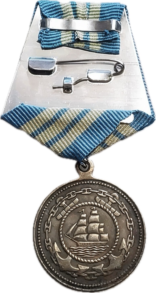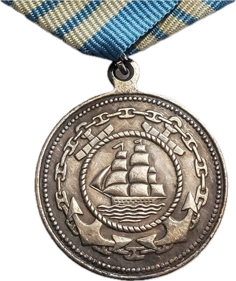 The elegant ribbon displays blue and white diagonal stripes, reflective of maritime service and closely resembling the original suspension design. The reverse side showcases a majestic three-masted sailing ship encircled by a chain, flanked by anchors?symbolizing the enduring strength and legacy of naval heritage.