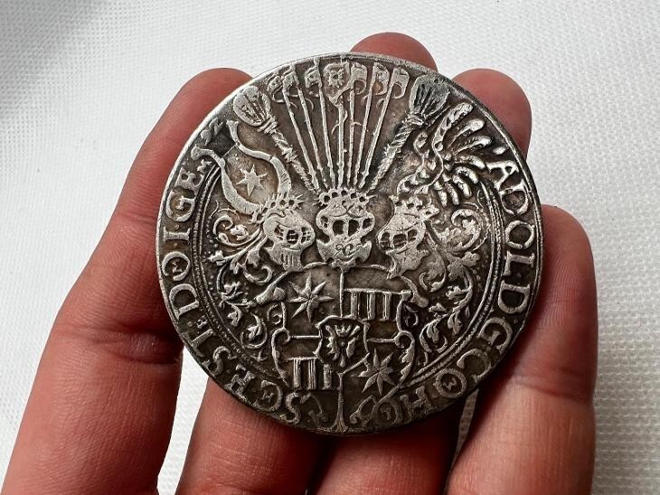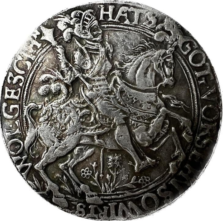 Sul retro, la medaglia e finemente adornata con elementi araldici, con stemmi dettagliati e simboli di lignaggi nobili. Cio significa non solo la sua funzione di moneta, ma anche di rappresentazione del potere politico e familiare. Storicamente, le T?íreichstalery originali furono coniate in quantita limitate durante il XVII secolo, servendo come monete prestigiose circolate tra l'elite o offerte come regali in contesti diplomatici.