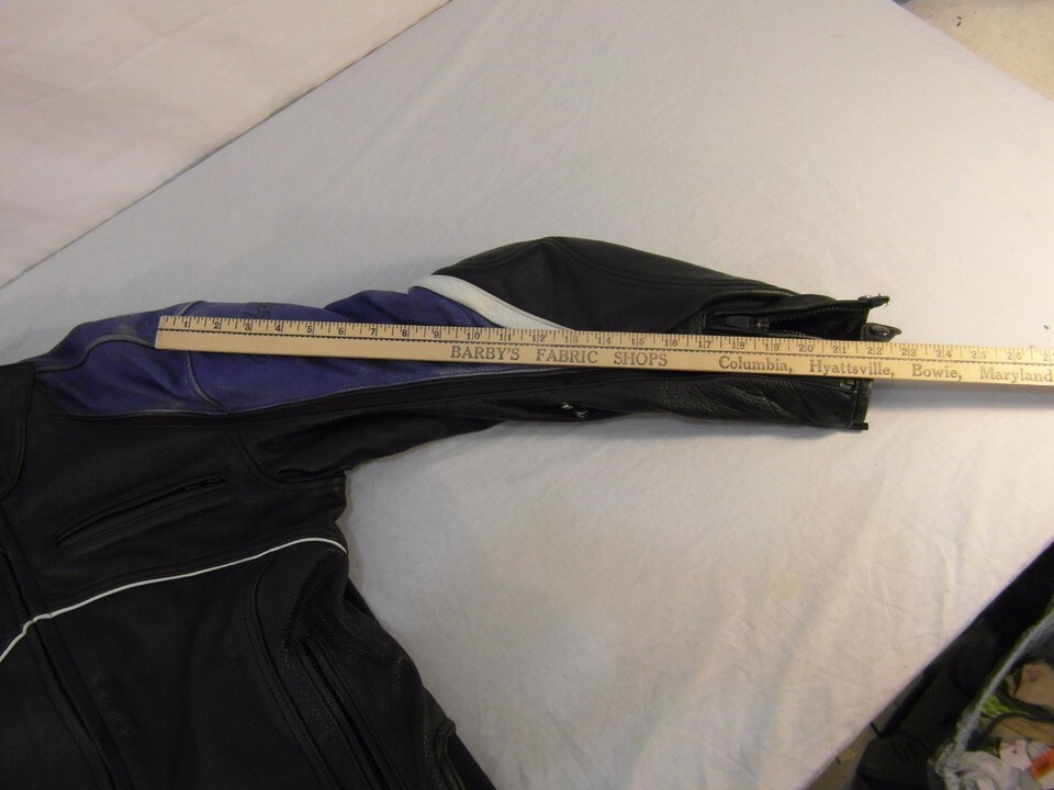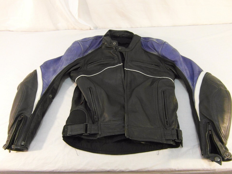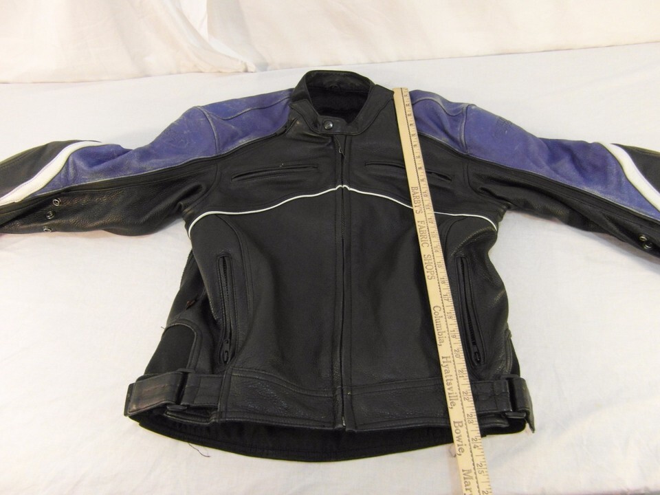 Adult Men's Rocket Racing Motorcycle Stuntman Blue Black THICK Jacket Size: Size Tag Is Missing ~ See Photos For Measurements Color: Blue Black Condition: Pre-Owned Defects: Leather Is Worn In Some Spots But A Great Jacket This Is!!! Thank You for looking at my Store. I am a United States Army Veteran and our Store is Veteran Owned and we count on an honest transaction. We have a no hassle return Policy. It?s really simple if you don?t like it please return the item and I will issue you a refund. I have quickly learned that Customer Satisfaction is the number one Priority. My Store is open for Business and I invite everyone to take a quick look at what I have...Just click here and see all that I have http://stores.ebay.com/allamericanauctions2015 . We now ship every day to include SATURDAY AND SUNDAY? which means our carrier service now picks up 7 Days a week. If you BUY TODAY? your ITEM will get out no later than 72 hours after your purchase. It will have the best head start as it will be processed at the Denver Hub within 72 Hours of your purchase. Even if you buy at night your Item will be processed the next two mornings and will be at the Denver Hub WITHIN 72 HOURS. We have Incredible FAST SHIPPING and again WE NOW SHIP ON SATURDAY AND SUNDAY. If you have any questions please MESSAGE ME... If you have any CONCERNS please MESSAGE ME. If you have any ISSUES with your Item please let me fix it. I count on your Business and in return I will give you an Honest Auction. I look forward to doing Business with you. View more great items