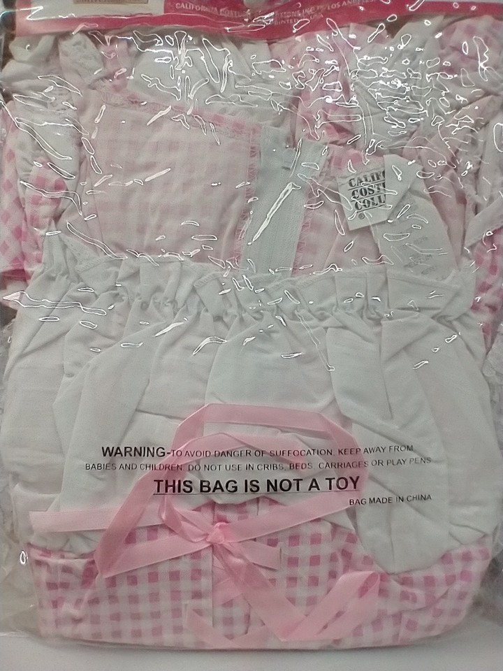 ADDITIONAL INFO: NEW IN PACKAGE BUT OLDER ITEM. EXPECT WRINKLES / CREASES IN FABRIC. Longer Loose Threads need trimming. Some colored specks on pink ribbon. This is just what I can see through the packaging. Plastic outer package has open area. Some package inserts have different model images. Please see all images for an idea. SOLD AS IS.