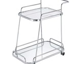 Grab the attention of your guests with a movable feast. This serving cart features two tier shelf that allow you to set drinks and snacks on top. It is founded atop a clean-lined metal frame, with clear glass and chrome finish that showcase a streamlined, modern aesthetic. There are also side rails and wheel stop included for safe and secure storage for your fragile glassware and wine collection.