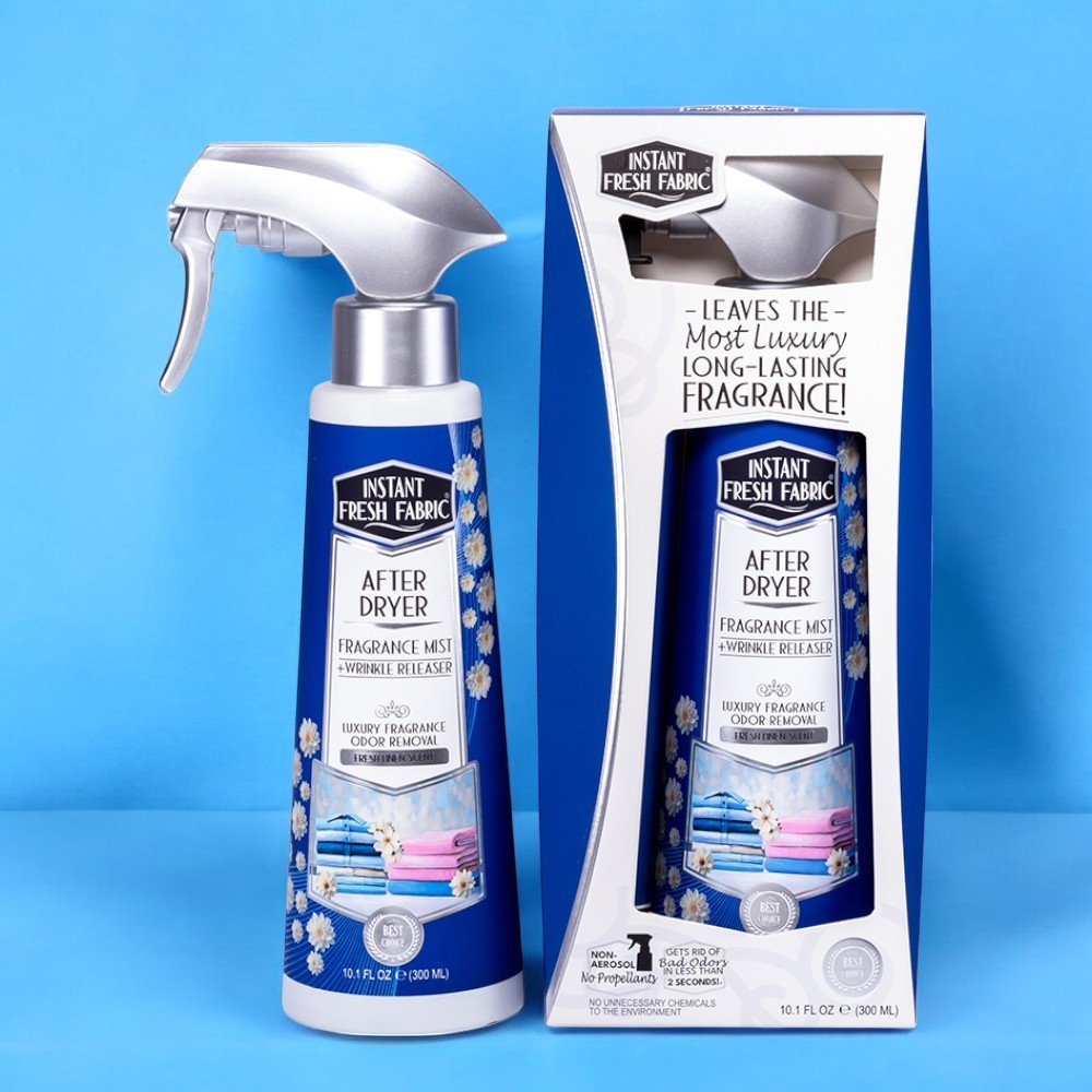 The heat from dryers can reduce and minimize the scent of detergents and fabric softeners on clothes. This product provides a premium, long-lasting fragrance applied directly to the fabric. It contains microcapsules that help maintain the fragrance in the fabrics for a long time, which are released when the clothes are worn. It also contains an ingredient that greatly eliminates wrinkles and will eliminate any bad odor, such as humidity, when clothes are not dried completely.