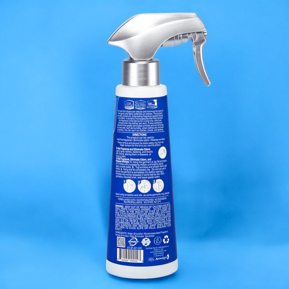 How to Use: To Add Fragrance and Eliminate Odors, Lightly spray clothes, bedding, and towels after folding, placing them in drawers, or hanging them. To Add Fragrance, Eliminate Odors, and Release Wrinkles: 1. Hang the garment or lay flat and spray 8-12 inches with a sweeping motion until slightly damp; apply on both sides. 2. Tug wrinkles and smooth fabric with hands. 3. Hang and let completely dry. Do not over-wet it; ensure the garment is completely dry before wearing it. Wrinkles may not be released in some fabrics like 100% synthetics, recycled linen, and lower-grade cotton. Avoid using on leather and silk, as some garments may discolor.