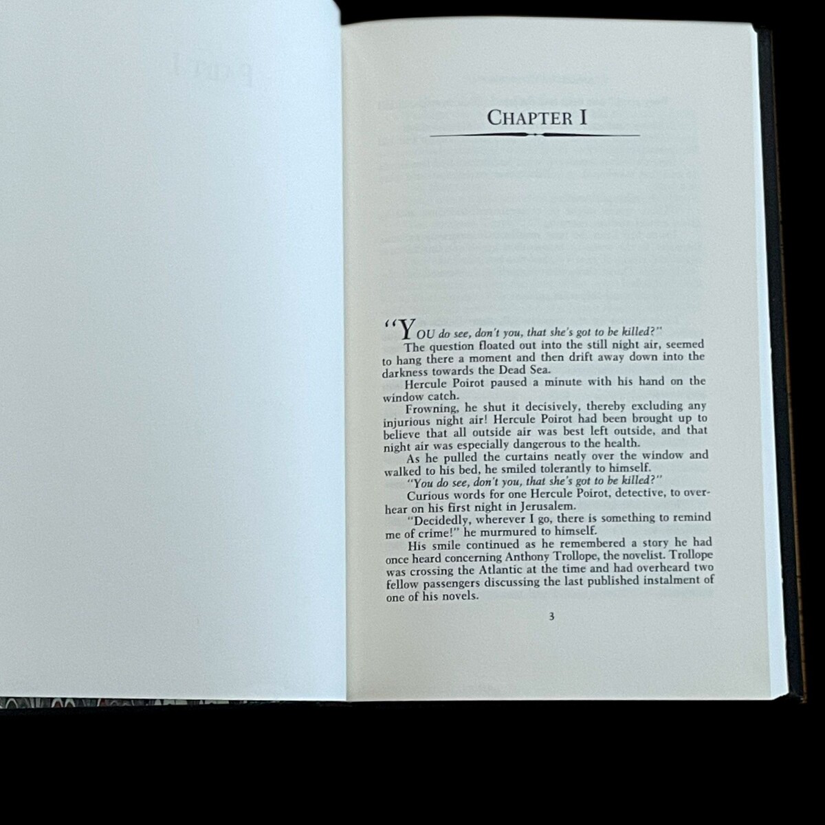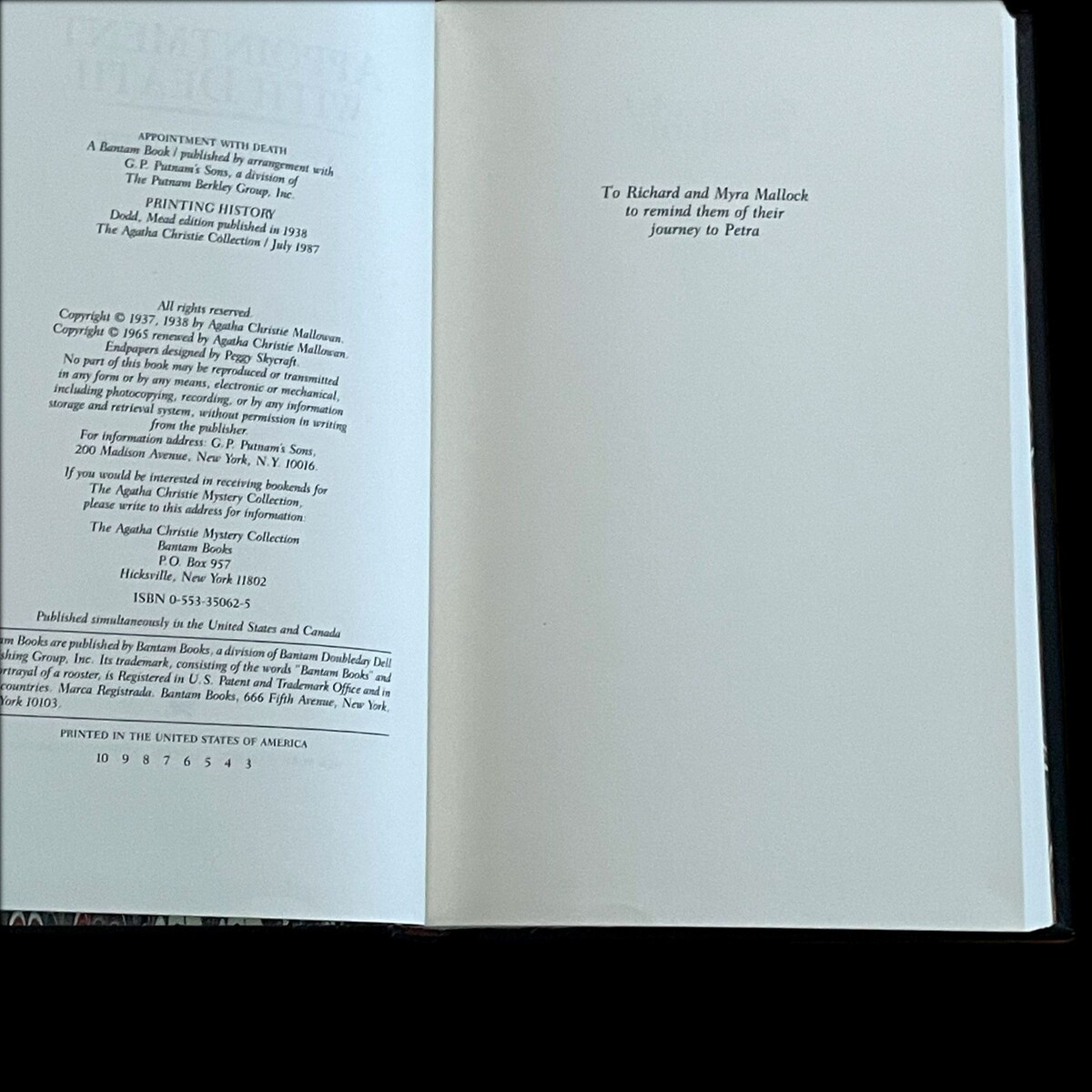 Originally published in 1938, Appointment With Death features Hercule Poirot and is set mainly in Petra and Jerusalem, reflecting Christie's experiences traveling in the Middle East with her husband, the archaeologist Sir Max Mallowan. Bantam Books published this 1987 edition as part of the Agatha Christie Mystery Collection.