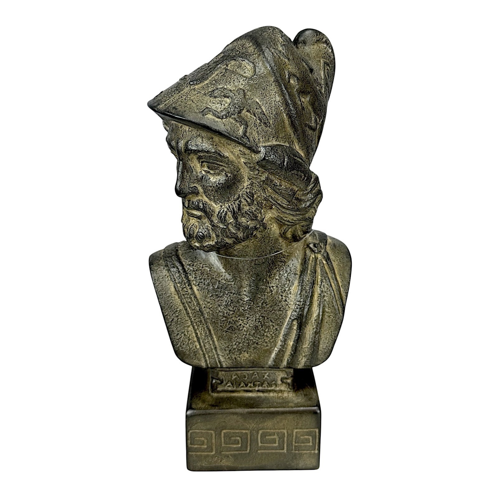 This detailed sculpture represents Ajax the Great, the heroic figure from Homer's Iliad, known for his towering courage and warrior spirit. Handmade and hand-painted in Greece using 100% natural non-toxic hard plaster with no chemical additives.