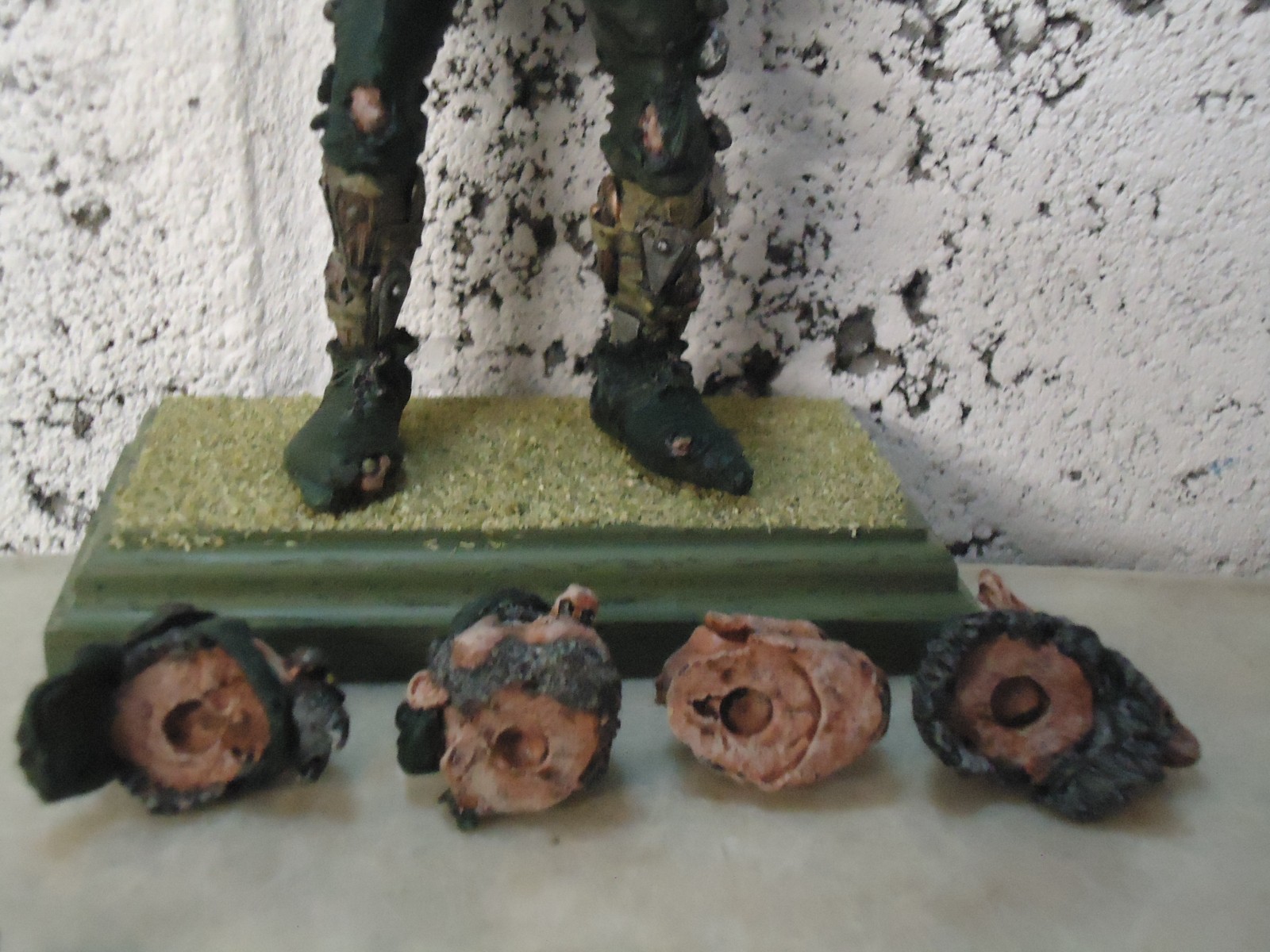 Welcome to my sale of the big boy, the 1983 citadel giant. This is the version with the torso in 2 pieces and features Alan's signature cast into the metal of one half of this. The torso and legs/waist are all held with traditional superglue and milliput, no drilling or pinning has occurred. 4 of the 5 heads are included, as are all 3 victims and the sword. I only have the arm and hands shown, sadly not the other 2 hands or the other forearm but this makes no difference to the finished piece. None of the heads are glued and can be swapped as you prefer. I do not have the original metal base but have included a custom wooden plinth base, again not glued to the feet.
