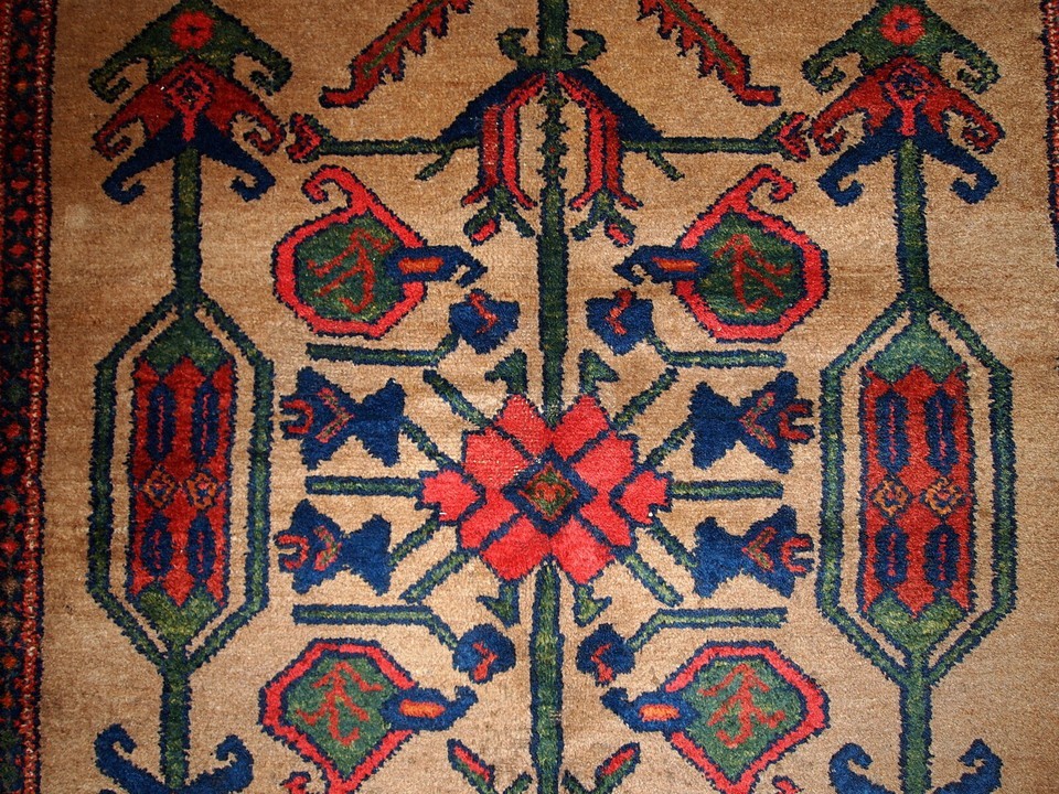 Antique Kurdish rug in light brown background colour. Very primitive tribal design with large ornaments. The rug is in original good condition.