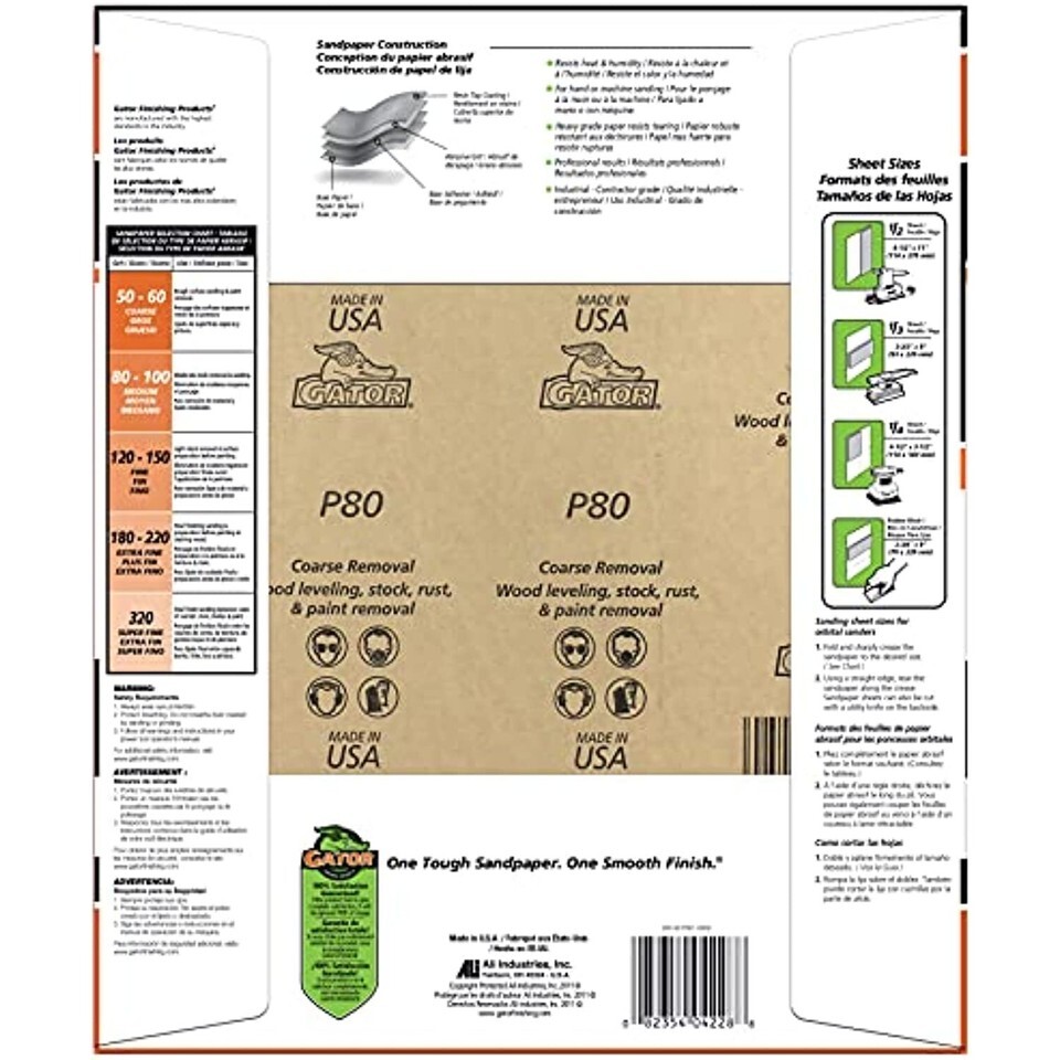 Product Description These bare wood sandpaper sheets are specifically designed to sand and prepare bare wood surfaces, these sanding sheets will make your next woodworking project a total success. Ideal for working on wood, furniture, cabinets and trim. Offered in a complete range of grits from your initial sanding and surface preparation to providing that final smooth surface before applying your finish. Made with a durable heavier weight paper that is perfect for either hand or power tool sanding. From the Manufacturer Gator Grit 25 Count 9" x 11" 80 Grit Medium Garnet Sandpaper. The bare wood sandpaper is ideal for general wood sanding and final wood preparations before applying stain, varnish or paint. The sandpaper is great for either hand sanding or machine sanding. When using an orbital sander, you can cut the sheets into 1/2 sheet, 1/3 sheet, or 1/4 sheet to fit your orbital sander.