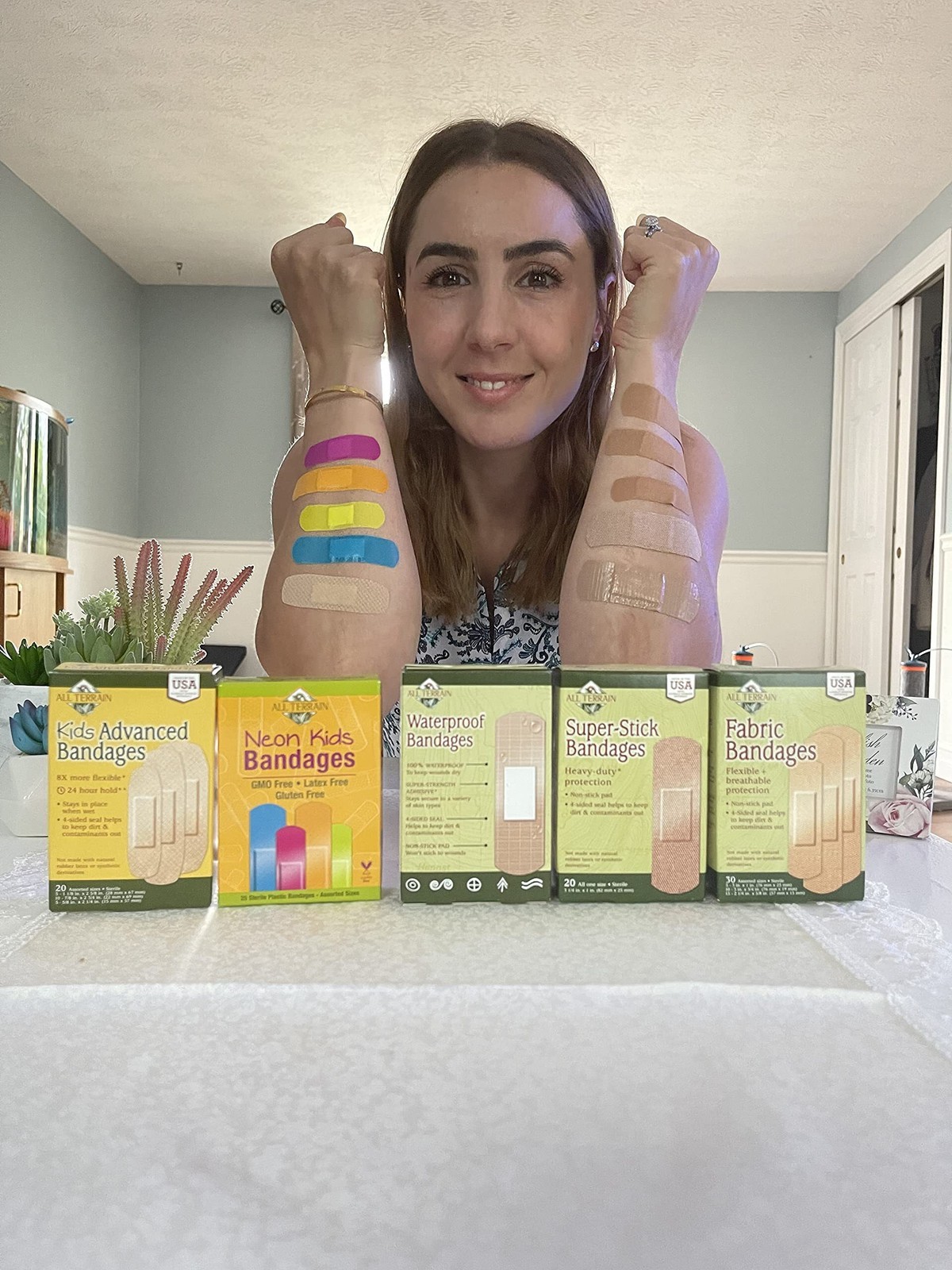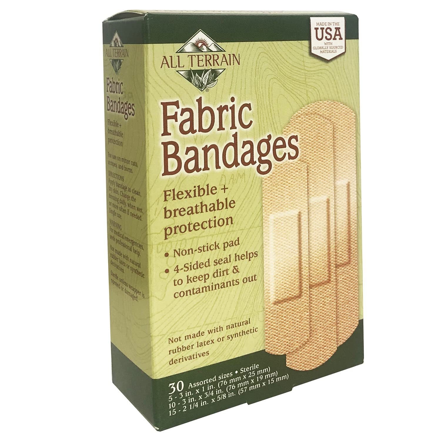 All Terrain Fabric Bandages, Latex-Free Flexible Protection, 30 Count, Assorted Sizes, Sterile ? FABRIC BANDAGES: All Terrain's latex-free and 100% sterile bandages are non-stick absorbent pads have flexible fabric that won?t irritate latex sensitive skin. Available in assorted sizes to cover small, medium large wounds gently ? LATEX-FREE: Fabric bandages are great for minor wounds like cuts, scrapes burns. They help keep wounds clean protected; use them with our Antibiotic Gel to prevent infection aid healing process. ? FLEXIBLE PROTECTION: Provide gentle protection with non-stick pads that protect without sticking to the wound for pain-free removal. They're great to have in first aid kits, backpacks, purses, gym bags cars. ? ACTIVE LIFESTYLE: Started by an outdoor enthusiast, All Terrain offers a broad line of safe effective insect repellents, sunscreens, topical first aid itch relief products using natural ingredients ? ALL TERRAIN: We are committed to providing safe effective cruelty-free skin care protection products to help you your family live active, healthy lives. (description exceeds maximum possible length)
