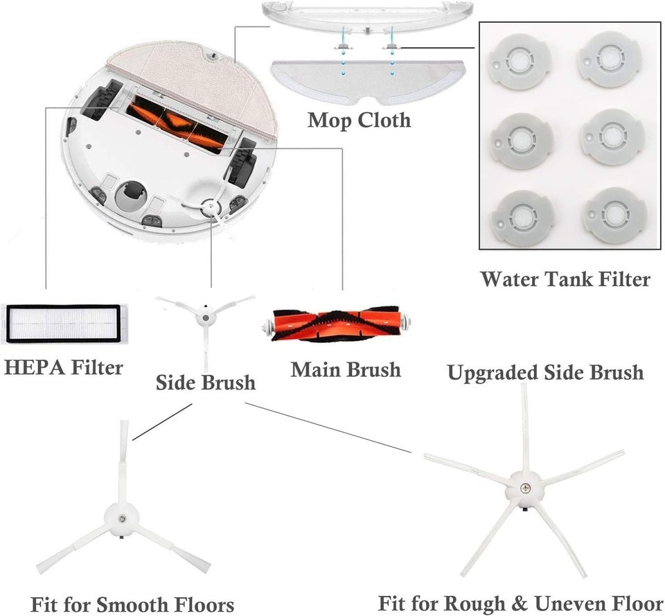 Upgrade your Xiaomi Mi Mijia and Roborock robot vacuum with our comprehensive compatible accessories kit. Designed to fit a wide range of models (excluding Roborock S7 S7+), this all-in-one set includes 6 side brushes, 4 filters, 2 roller brushes, 4 mop cloths, 6 water tank filters, and 2 bonus cleaning tools?everything you need to keep your vacuum operating at peak performance. Crafted with durable, rubber-coated bristles, our parts are built to last and gently handle hairs and debris without getting stuck. Easy to install without extra tools, our accessories make maintenance simple and hassle-free. Experience reliable cleaning, high-quality materials, and unmatched convenience?your vacuum deserves the best.