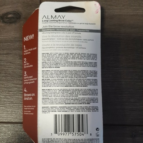 Almay Long Lasting Brow Color The Brow Lives On 040 AUBURN Full Size We know how much you hate doing your eyebrows and how time-consuming the whole process is. To you we say, "Color and peel off!" Almay has the best solution for you and it's absolutely impressive. This Long Lasting Brow Color is a peel off formula that works like wax minus the pain. Layer the color on top of your brows in whatever shape you desire, let it dry for 30 minutes ? You can make breakfast, get the kids ready for school or even finish the rest of your makeup routine? then peel off confidently and go! The color layer will tint your eyebrows with a beautiful, long-lasting color that lasts all day! Eyebrow color. Peel off formula. Apply, let dry and peel! Ultra long-lasting color. Hypoallergenic. Dermatologist tested. Fragrance free. 100% authentic always ships with care fast and free from JOSEPH COSMETICS NJ