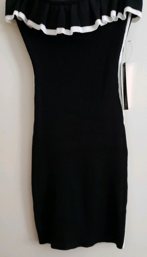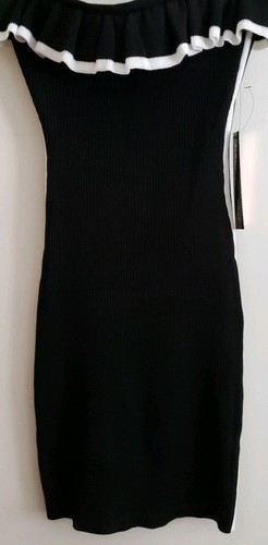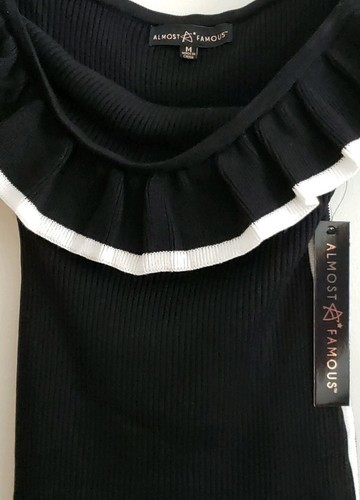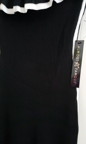 This sale is for one (1) Almost Famous Brand Dress Women's Size Medium Strapless dress Solid black w/double white stripes down each side white trim around top ruffle Measures approximately 28" from center front to hem edge Measures approximately 14.5" across top (laying flat) 78% Nylon ~ 22% Polyester Pullover dress This dress is brand new with tags Please view photos for a good description of this item Thank you!