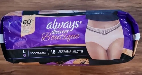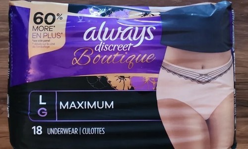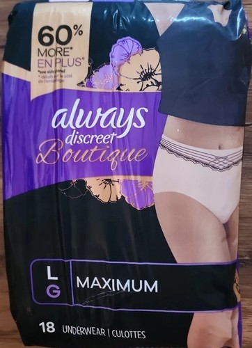 This sale is for One (1) Package of Always Discreet Boutique Underwear Incontinence Postpartum Underwear for Women 18 Count Womens Size Large (L) 170 - 260 lbs 38" - 50" Hidden inside is a super absorbent core that turns liquid to gel to absorb even your heaviest leaks Design fits close to your body for a smooth fit under clothes Curve-hugging ~ feminine design that defines your silhouette Made of silky-soft fabric with delicate ~ lacy print Looks ~ fits ~ and feels like your real underwear You can feel protected and pretty ~ unlike adult diapers Lightly Scented Sensitive Sensible Underwear are new in sealed packaging Please view photos for a good description of this item Thank you!