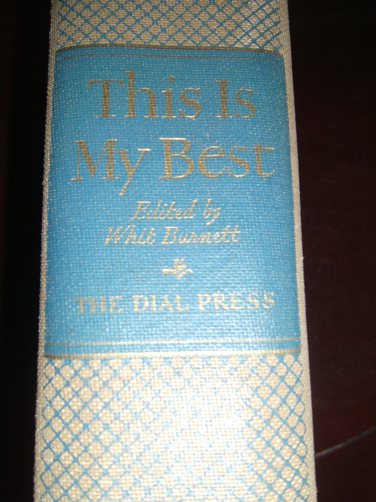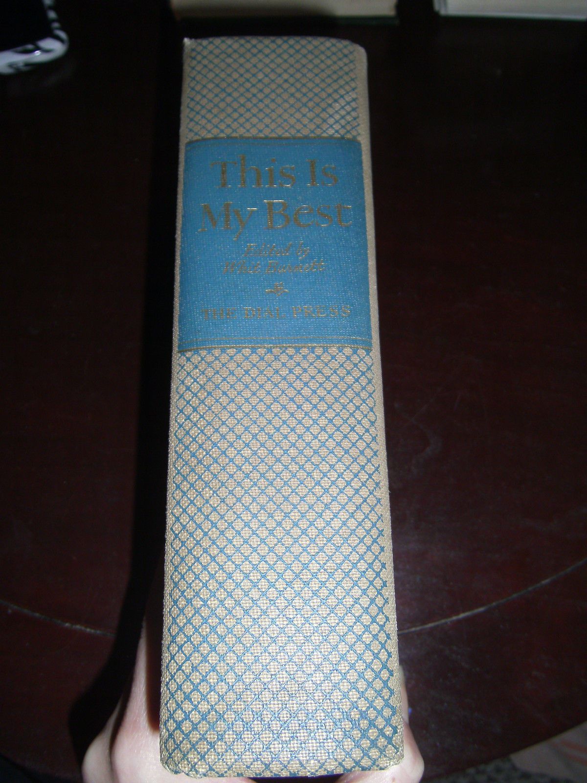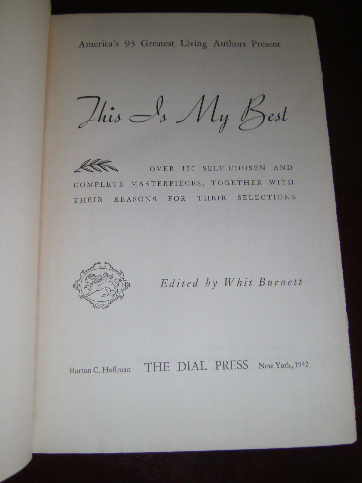 America's 93 Greatest Living Authors Present This is My Best 1942 Whit Burnett. Hard cover with 1180 pages. Very thick book. Inscription in front with year of 1942. I see no other writing throughout, book is solid. Light tanning of pages from age, but all text is readable. Tops of pages edges are blue, and this has some discoloration to it, please see photos. Includes Hemingway, Sinclair Lewis, Benet, Cummings, Doren, Frost, EB White and so many more, excellent collection. Estate sale purchase.