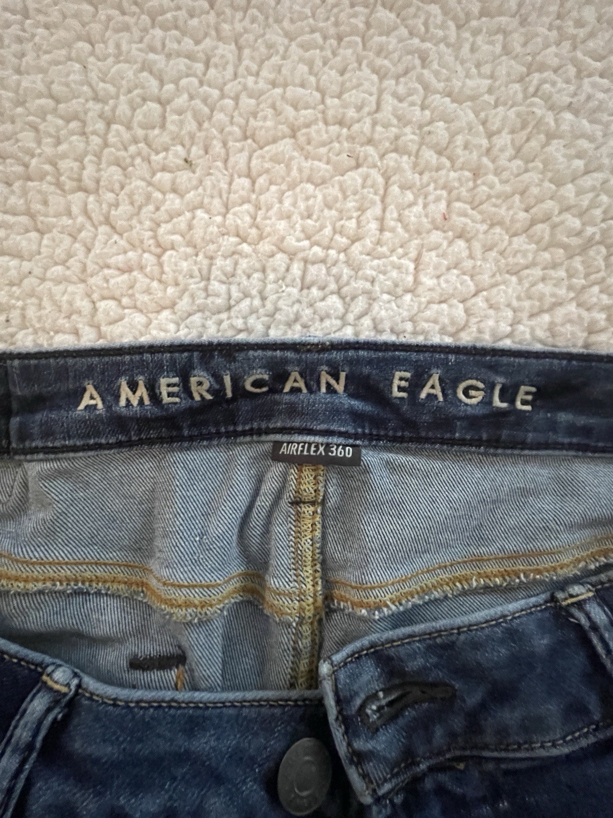 The American Eagle Jeans Level Flex for Men in size 34X32 offer a slim fit with a mid rise and straight leg style. Made of cotton denim fabric, these jeans feature a 5-pocket design with a zip closure and distressed accents. The classic blue color and solid pattern make them versatile for all seasons. With the American Eagle logo as the only accent, these machine washable jeans are a stylish and comfortable choice for everyday wear.