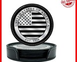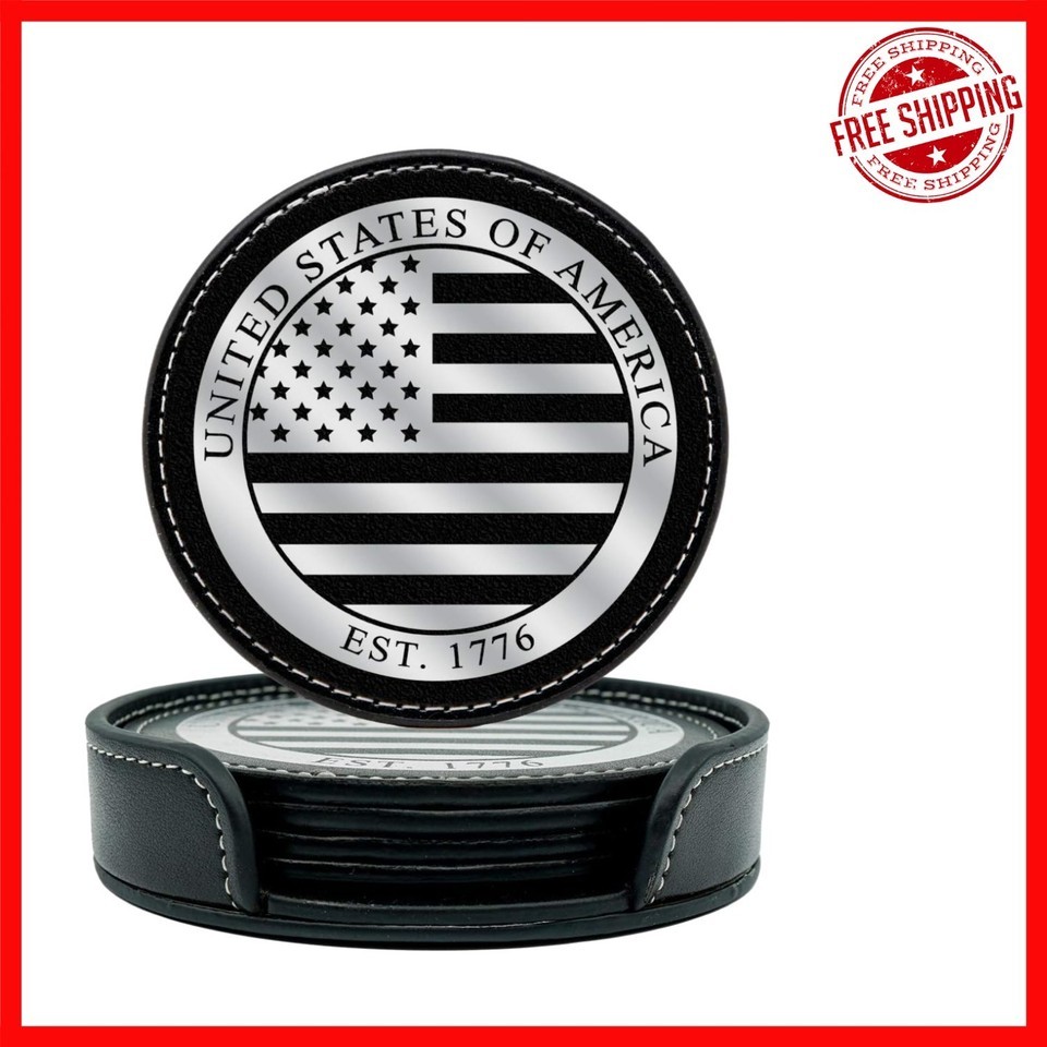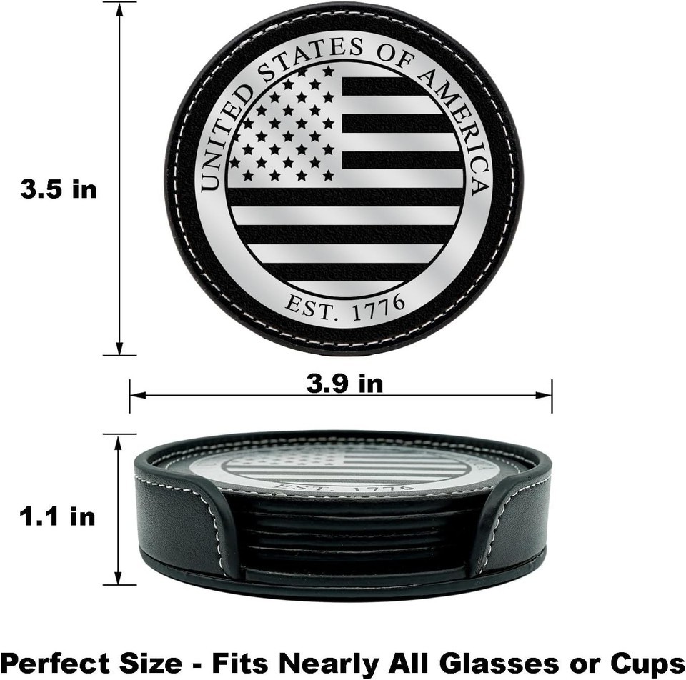 Elevate your home decor with our American Flag Coasters Set, crafted from top-quality materials for superior durability and stylish protection. This set of four PU leather coasters (3.5 inches) features an intricately hot stamped and embossed American flag, accented with white stitching along the edge for a refined look. Ideal for protecting your dining table, coffee table, or office space, these coasters combine patriotic elegance with practicality. The included matching holder ensures compact storage when not in use. Easy to clean with a damp cloth, these coasters maintain their pristine appearance over time.