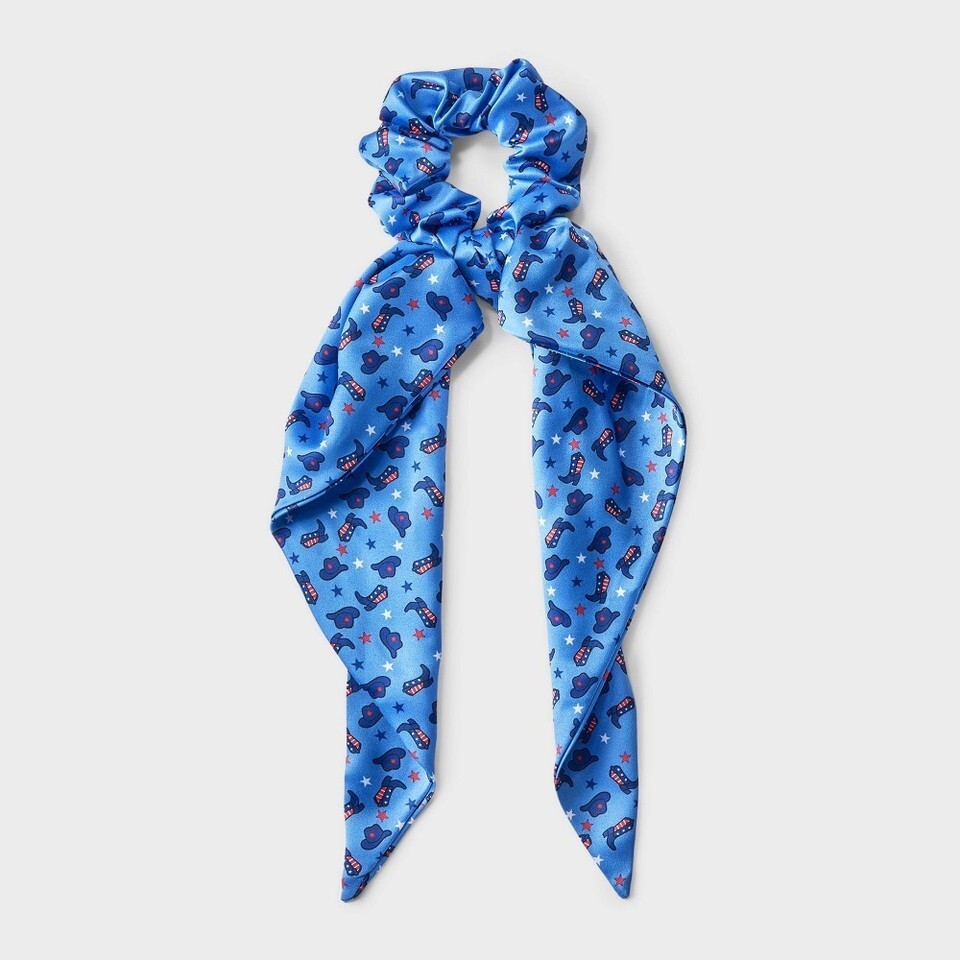Add a fun pop of red, white and blue to your hair with this Americana Hat and Boot Print Hair Twister with Tails - Red/White/Blue. The soft fabric feels comfy all day, and the playful tails give your ponytail or bun a little extra flair. Whether you're heading to a barbecue or just love a western vibe, this twister is a cute and easy way to show off your style.