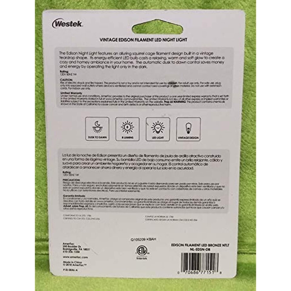 The Westek NL-EDSN-DB Automatic Vintage Edison Light is the perfect night time lighting solution. This device automatically turns on in low light conditions, projecting 8 lumen of warm, amber light. The LED filament has a vintage design that makes for an excellent accent light and adds a 19th century flair to any room. Great for hallways, entryways, living rooms and more. AmerTac manufacturing brands offer complete lines of distinctive decorative home accent products that include trend-setting wall plates, money saving LED night lights, innovative under cabinet lighting and LED battery operated lights. We also offer utility product lines including energy-saving timers, dimmers and lighting controls, as well as an extensive offering of consumer electronics accessories for the home and office.; ; Brand Name: Westek Automatic or Manual: Automatic Power Source: Plug-in Design: Vintage Edison Light Source: LED Product Type: Night Light Smart-Enabled: No Width: 1.5 in. Lumens: 8 lm Energy Star Certified: No Packaging Type: Carded Number in Package: 1 pk Color: Bronze Motion Sensing: No 4.2" H x 1.5" W x 1.5" (w/o plug)