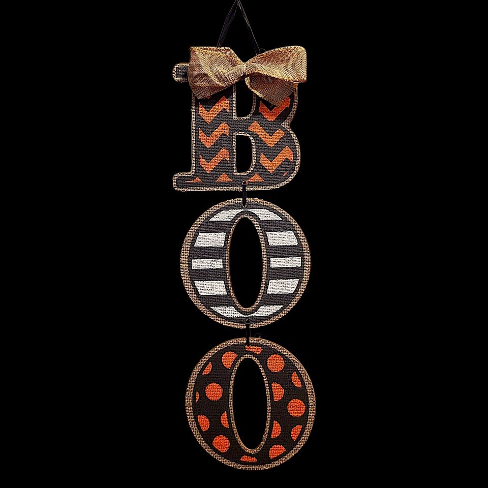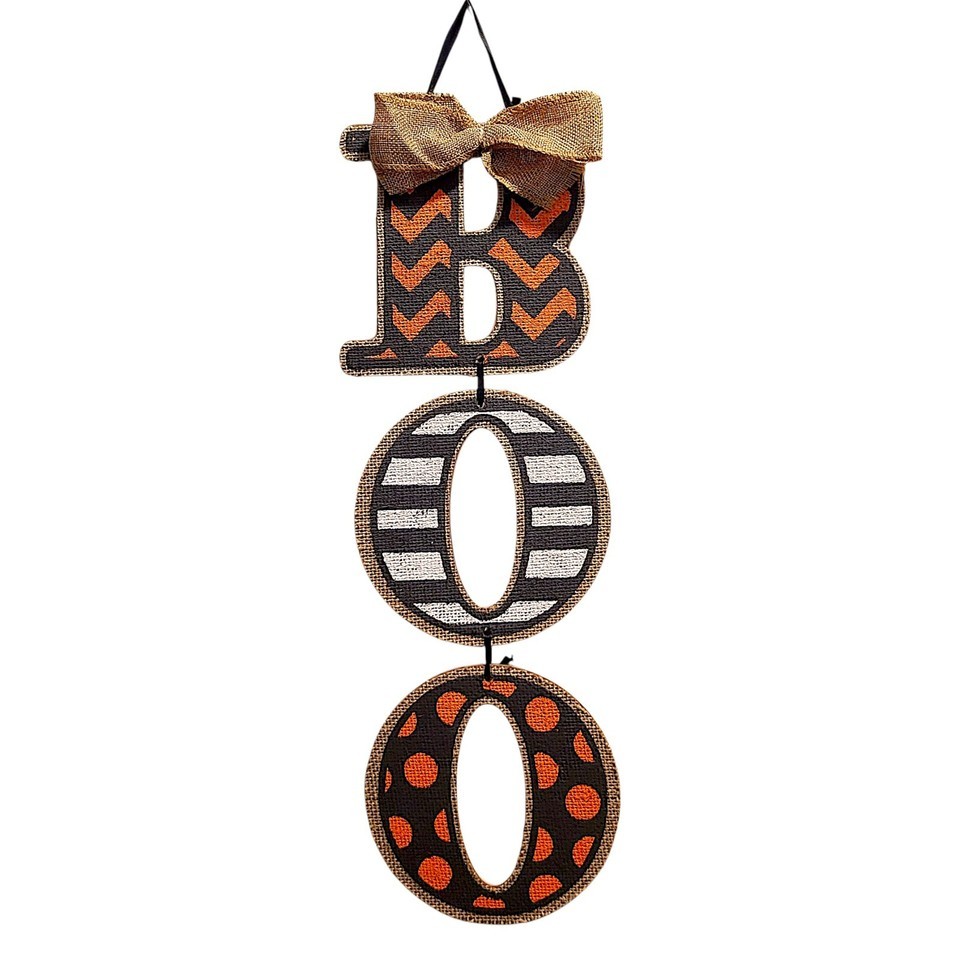 Amscan “BOO” Vertical Halloween Sign – Chevron, Stripes & Polka Dots Burlap Bow