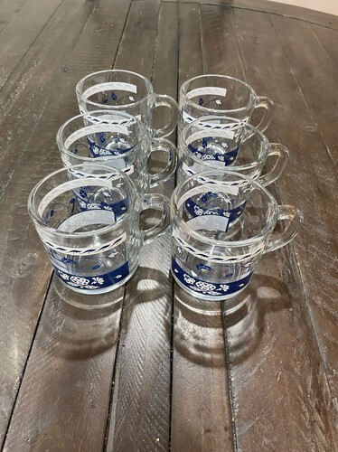 - Anchor Hocking Clear Glass Blue Old Blue Onion Floral Scene Mugs Set Of 6 MCM