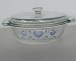 Vintage Anchor Hocking Ovenware Round Casserole Blue Hearts Clear Glass 1.5 Qt W/LID.