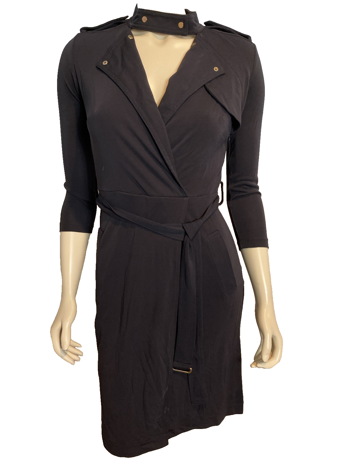 Ann Taylor Black Knit 3/4 Sleeve Faux Wrap Dress Size: 2 Black Knit 3/4 Sleeve Side Zip Pockets Faux Wrap Snap Neckline Belted Material: 67% Rayon, 33% Polyester Hand Wash, Line dry Measurements: Underarm to underarm: 17" Waist: 32" Hips: 42" Length: 37" See all photos. Non-smoking home. Be sure to check out my other items! I am happy to combine shipping charges. Please note: My goal is always 100% complete customer satisfaction. If for any reason you feel your item arrives "not as described," please contact me before leaving feedback. I am a trading assistant. I can sell items for you! |AMS-KPL|