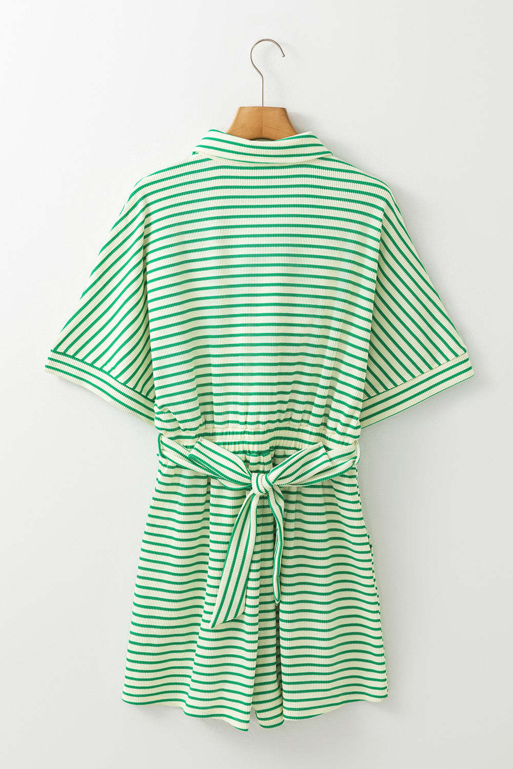 Step into this stylish striped romper that effortlessly combines classic and trendy vibes. The textured fabric adds a unique touch to your outfit, while the short sleeves ensure cool comfort. With a relaxed and loose fit, you'll be feeling breezy and chic all day long.