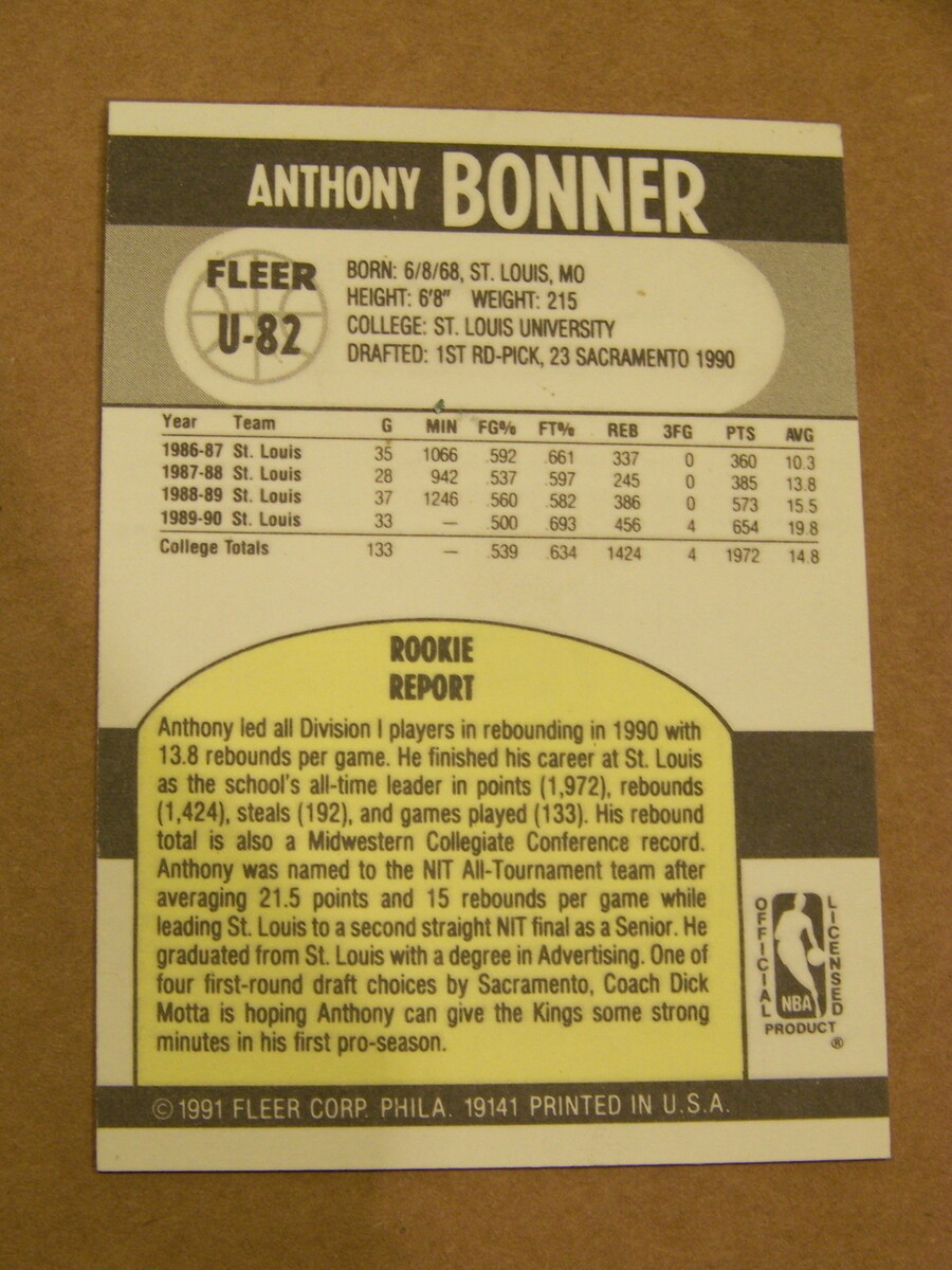 Primary image for ANTHONY BONNER AUTOGRAPHED FLEER 90 CARD SACRAMENTO KINGS BASKETBALL