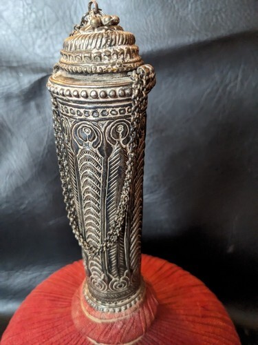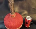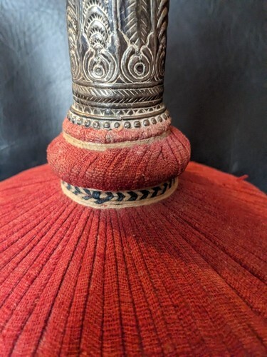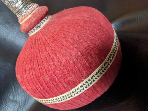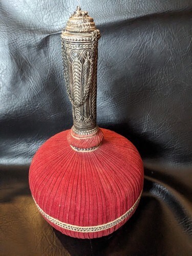 A vendre est une bouteille Surahi antique de 1800 avec un col floral en argent enveloppe dans un textile rouge avec un bouchon en provenance d'Inde qui mesure 14 pouces de haut. Le rumen globulaire est en zinc recouvert d'un textile rouge.