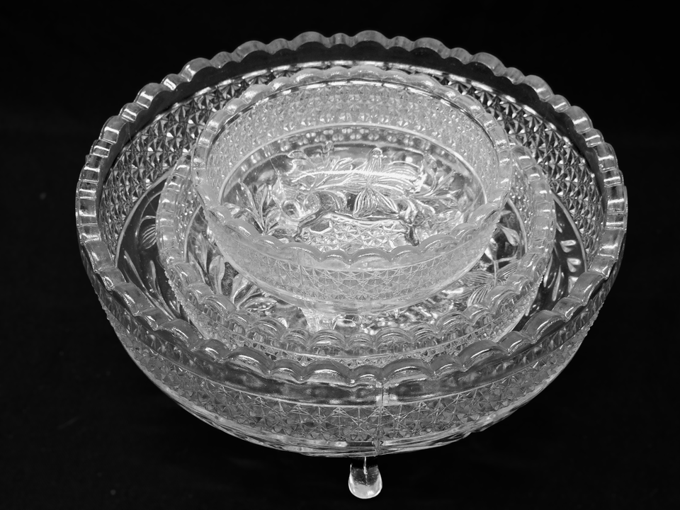 Antique Rose Point Band bowl set by Indiana Glass in excellent condition. Great clarity, no evidence of damage or wear. 7-piece set consists of a 7.5" serving bowl, two 5.5" smaller bowls, and four snack bowls measuring 4" in diameter. Great for serving all manner of foods and/or snacks. Circa 1913.