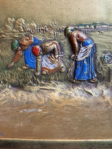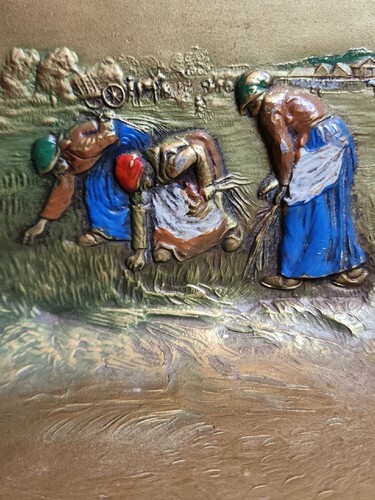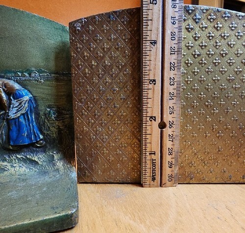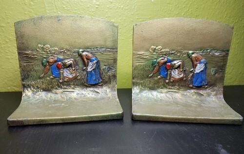 Antique 1920s K O Kroheim Oldenbusch "The Gleaners" Heavy Polychrome Spelter Bookend Set Kronheimer Oldenbusch Metal Novelties Co. (also identified as K O on marks) made this antique version of The Gleaners painting into this beautiful set of polychrome bookends. K O was in business from 1895 to 1939. Made of spelter, a metal alloy first introduced to Europe from the Orient by Dutch and Portuguese traders in the 17th Century, the finely detailed metal bookends show peasant farmers praying in the field over their crops in response to the ringing of the church bells in the distance. Made by the Kronheim Oldenbusch, New York, USA, the K O mark appears on the gold colored back of each piece, among the rows of fleur de lis. The artist's mark, "J Pickarski" appears on the lower right of each piece. It is shown in one of the photos. This set is quite heavy, weighing almost 8 pounds. Each bookend stands 4 1/2 inches tall and is 5 3/8 inches wide, 2 3/4 inches deep. Each bookend weighs 3 pounds, 14 ounces. The set is in very good condition, with a strong color. There are some wear marks on the corners and other protruding parts. Each one has felt on the bottom to prevent scratching. They are beautiful and functional. PLEASE REFER TO ALL PHOTOS FOR A BETTER VISUAL DESCRIPTION OF THE ITEM All of My Items Come from a Smoke Free Home I Strive to Ship Next Day Feel Free to Look Through My Other Listings Please contact me with any issues prior to leaving negative/neutral Feedbacks or low detail rating, as I will always do my best to solve any problems that may come up! Please refer to all photos above for a better visual description of the product being offered and it's condition. If you have any further questions, please feel free to message me Any props that are used in the taking of the photos are not included. Only the item/items in the title of the listings are being sold Notice Regarding Vintage Items: I specialize in vintage items that are usually 50+ years old. It is important that you examine this item carefully before bidding. I welcome all the questions. While I try hard to get my description accurate, you must look at the pictures and remember that vintage is NOT new or mint. Unless otherwise stated, items WILL have age related wear. These are usually items that are no longer manufactured or available by retail. I buy at estate auctions, yard sales, and antique stores, and I surface clean most but not all of my items. I try to describe my items the best I can. There is no intentional misleading information in my listings, but there may be a mistake or something missed occasionally due to human error. I do not smoke, however the previous owner(s) might have. If you buy or collect vintage, you must know that the items come from an era when the vast majority of Americans did smoke. Most of my customers want items in their authentic condition, which shows wear and proves age, so I leave any deep cleaning to the buyer's discretion. My items are sold in "as is" condition. I try to highlight any flaws over and above normal wear and tear, but again, you must look at the pictures and please feel free to ask questions.