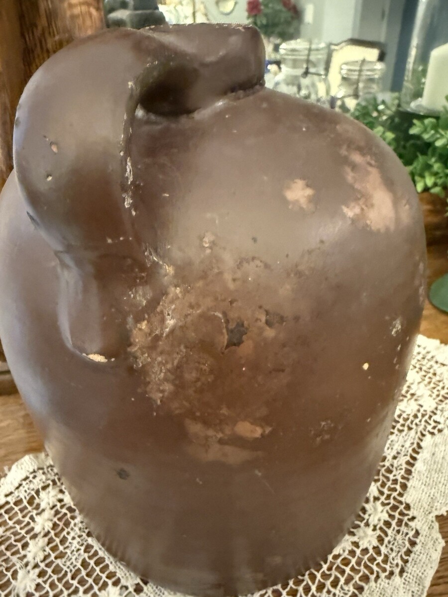 This jug has the wonderfully aged, barn-found primitive character collectors look for. There is visible glaze wear, mineral deposits, surface scuffs, and areas of slip loss, all consistent with 120+ years of storage and use. The body remains solid with no major structural cracks. Displays beautifully as a piece of authentic Americana.