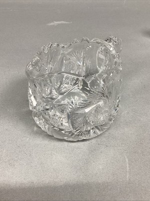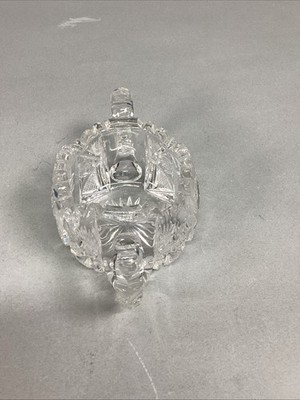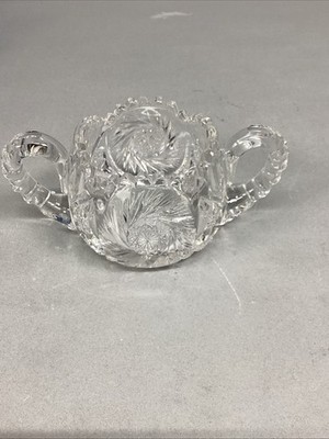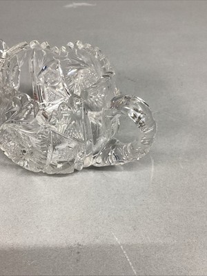 Antique American Brilliant Period Deep Cut Crystal Glass Creamer Sugar. Both have the sawtooth edging. In used condition. Both have a few chips on the top edging. I tried showing the chips in the pictures. Please closely check the pictures out. The creamer measures 5x3.25x3.5?. The sugar bowl measures 7? (to both handles) by 3.5?Dx3?H. Selling as is.
