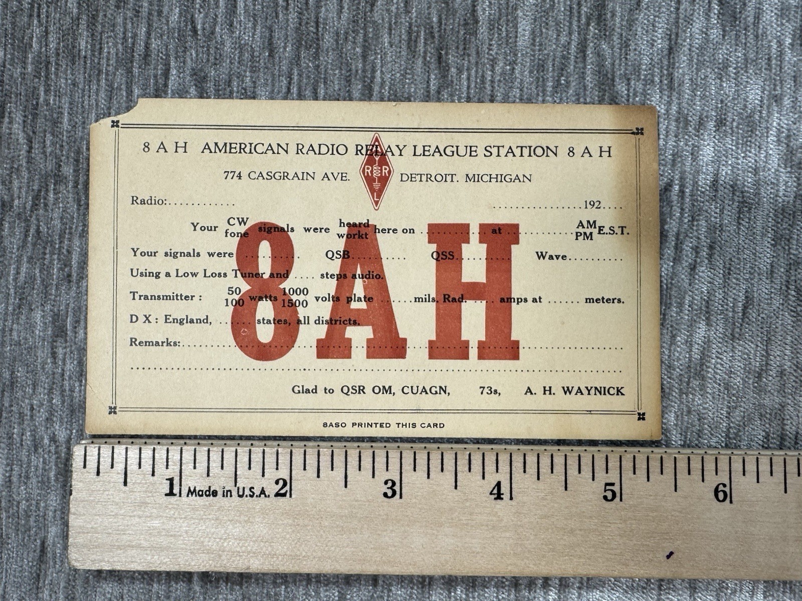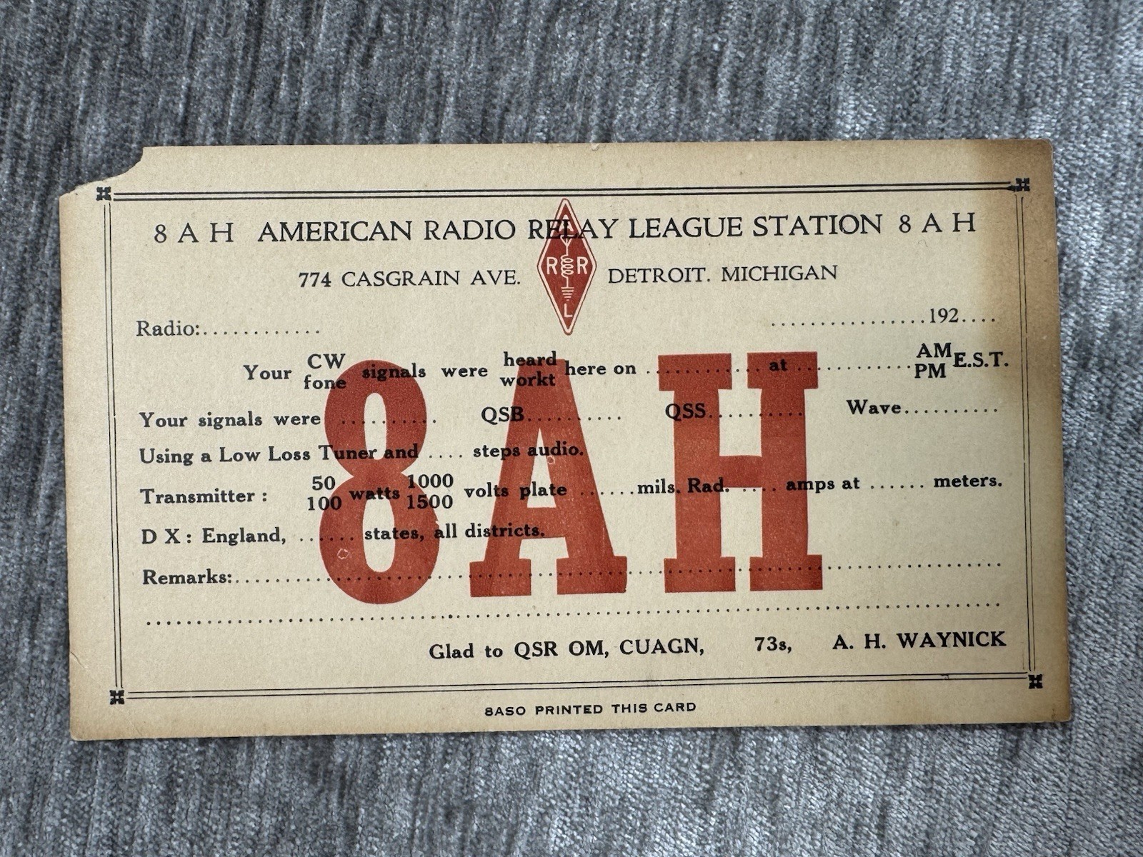 For sale is an Antique American Radio Relay League Station QSL Post Card 8AH Detroit, MI 1920s Not filled out as seen. Some antique wear, corner damage, browning, etc.