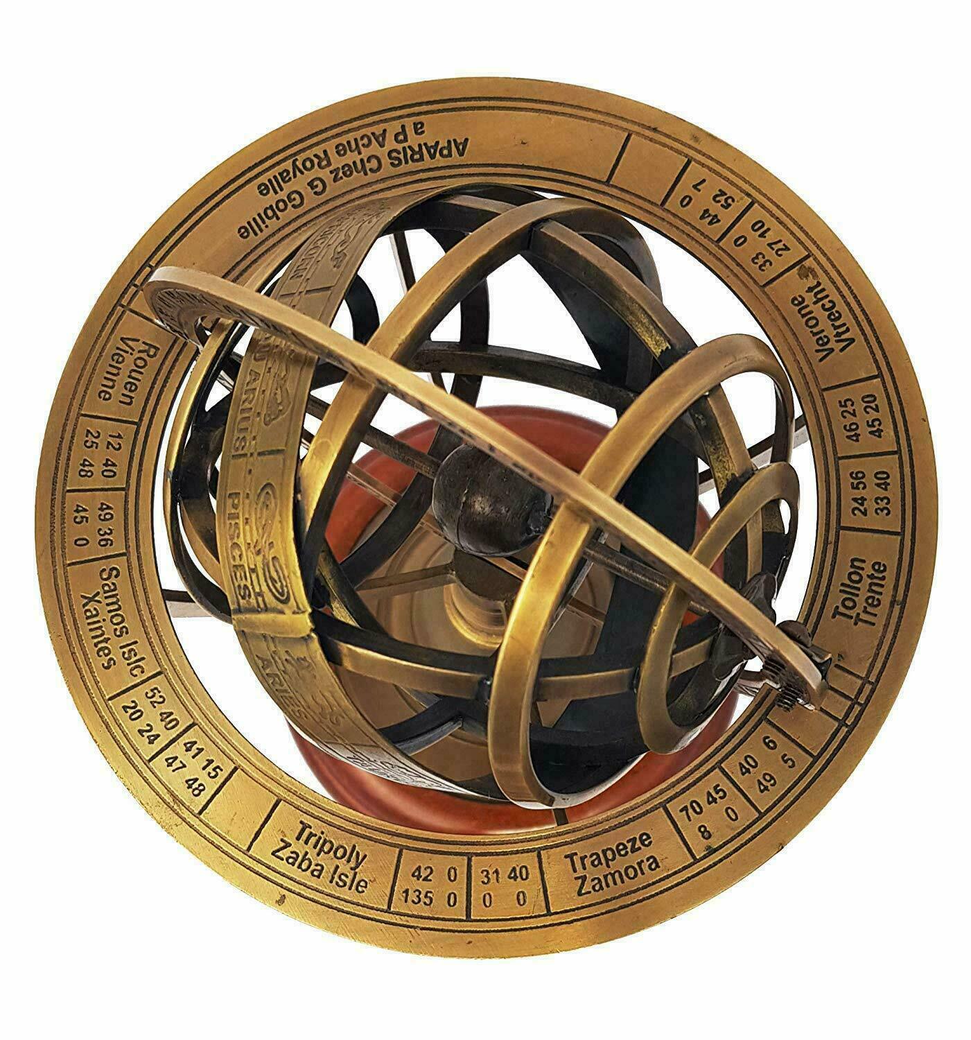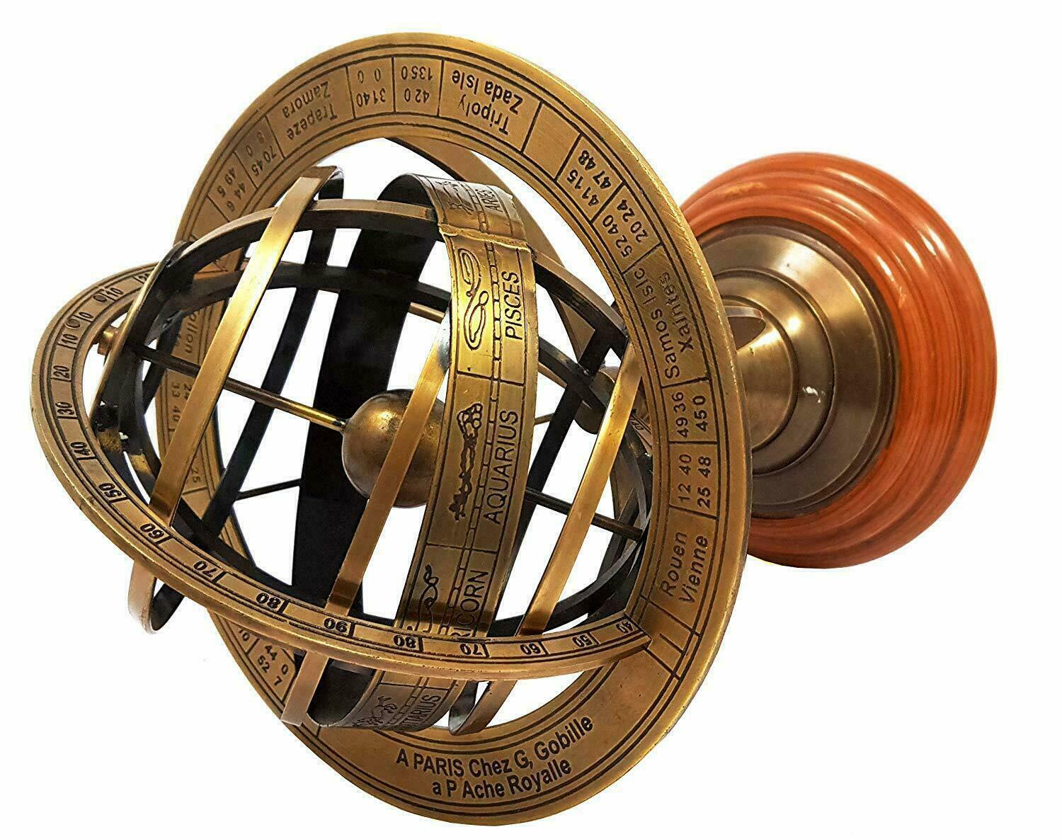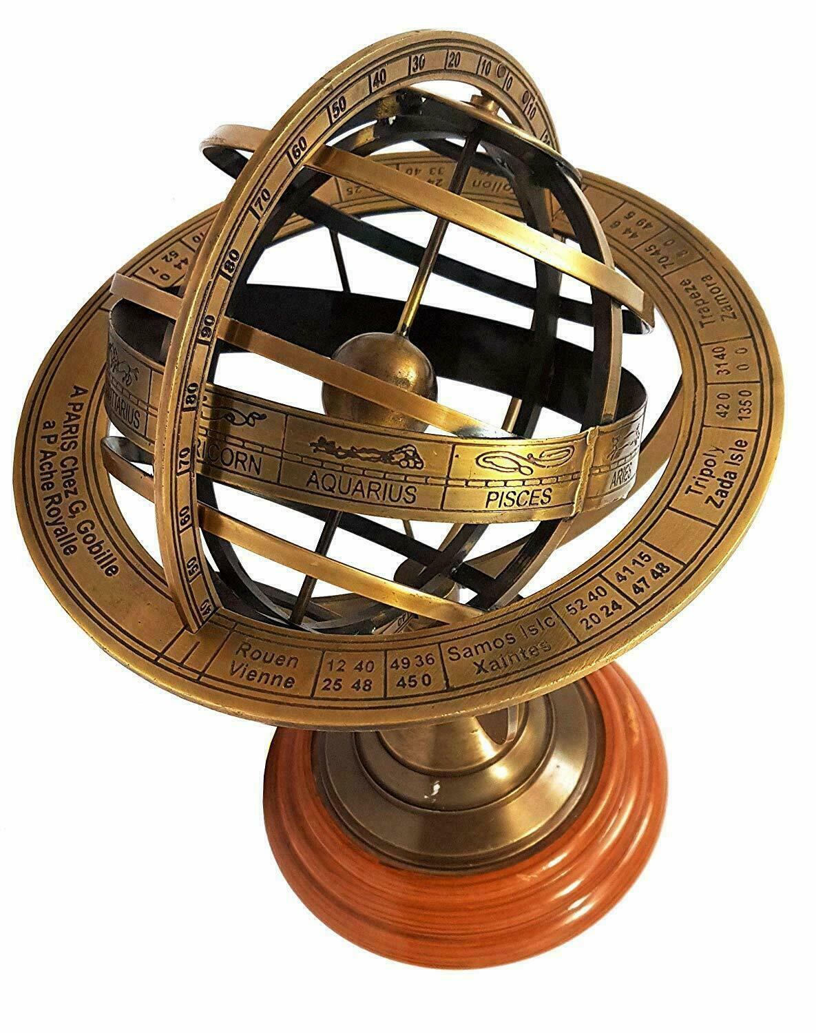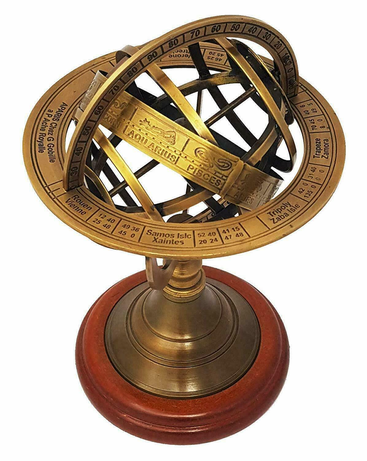 - Antique Armillary Brass Desktop Globe Sphere Wooden Base Vintage Astrolabe