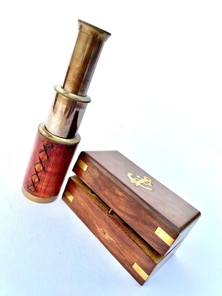Brass and leather folding telescope in a box is a great gadget for a sailing lover. It will make you feel like an explorer looking for unknown lands. The telescope will also be perfect as a prop for a pirate costume and as a gift for a fan of Pirates of the Caribbean.