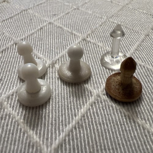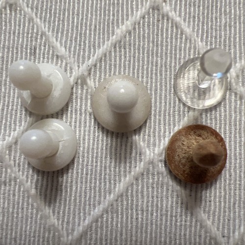 This antique set includes four plastic and one wooden collar buttons, all in a round shape and white color. Originating from the pre-1930 time period, these buttons are suitable for crafts and are considered to be original pieces. The mix of materials with both plastic and wood showcases the variety in antique collar button designs, making this set a unique addition to any collection or crafting project.