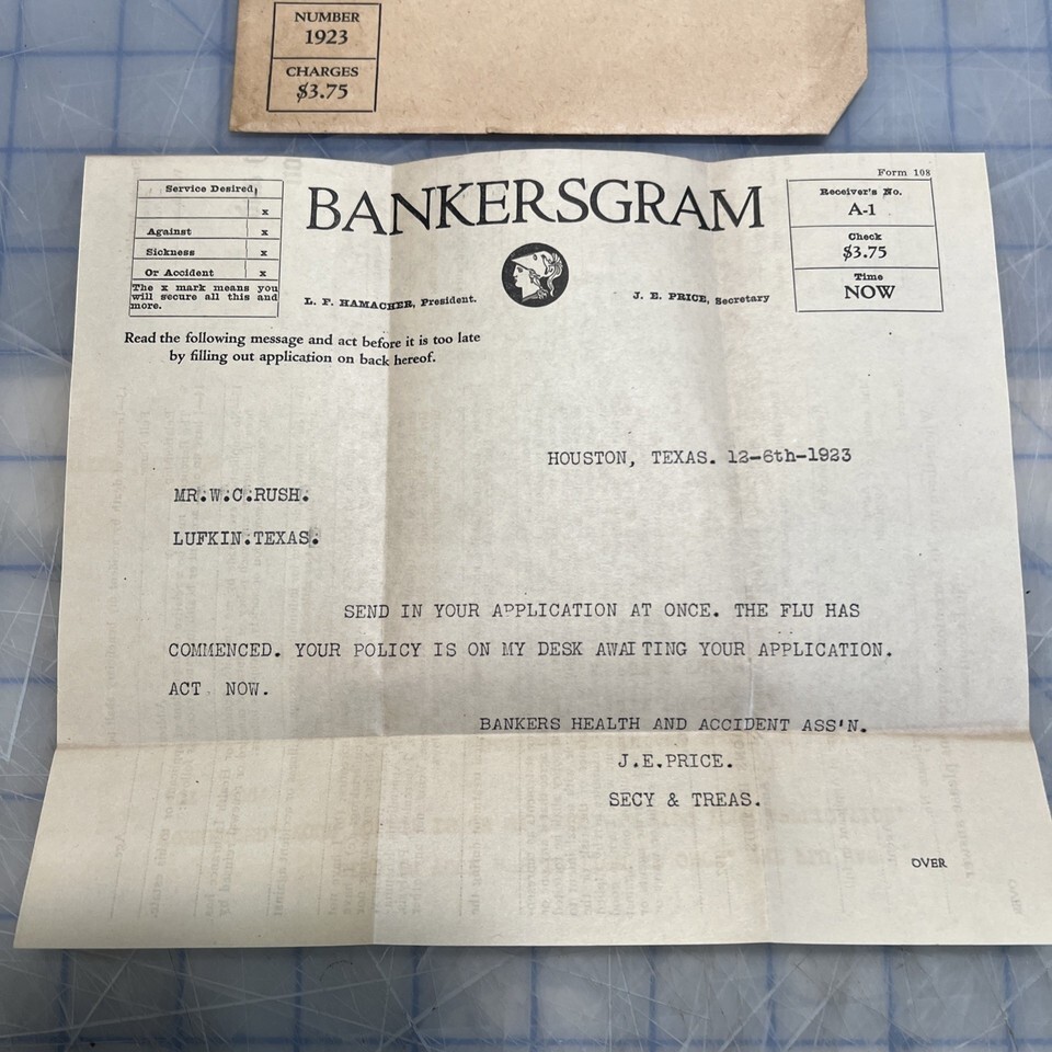 - Antique Document Bankersgram Houston Texas 1923 Flu Outbreak Insurance