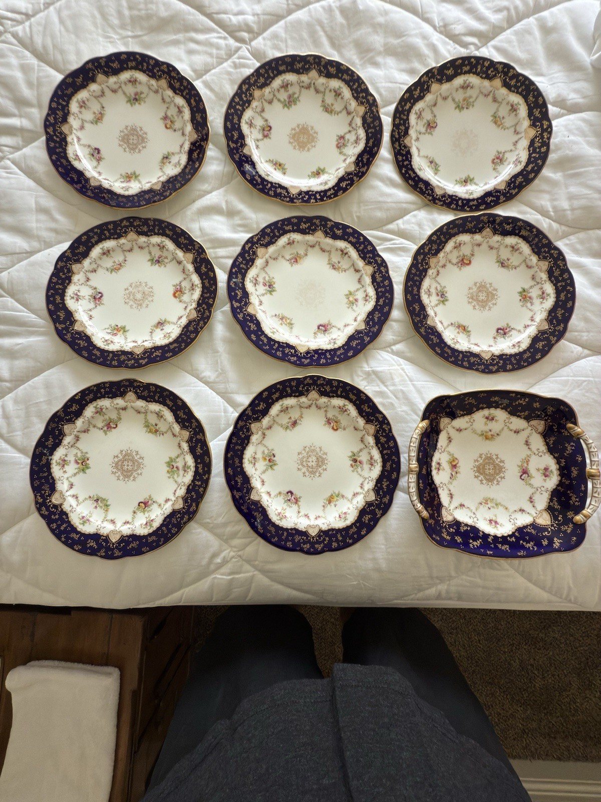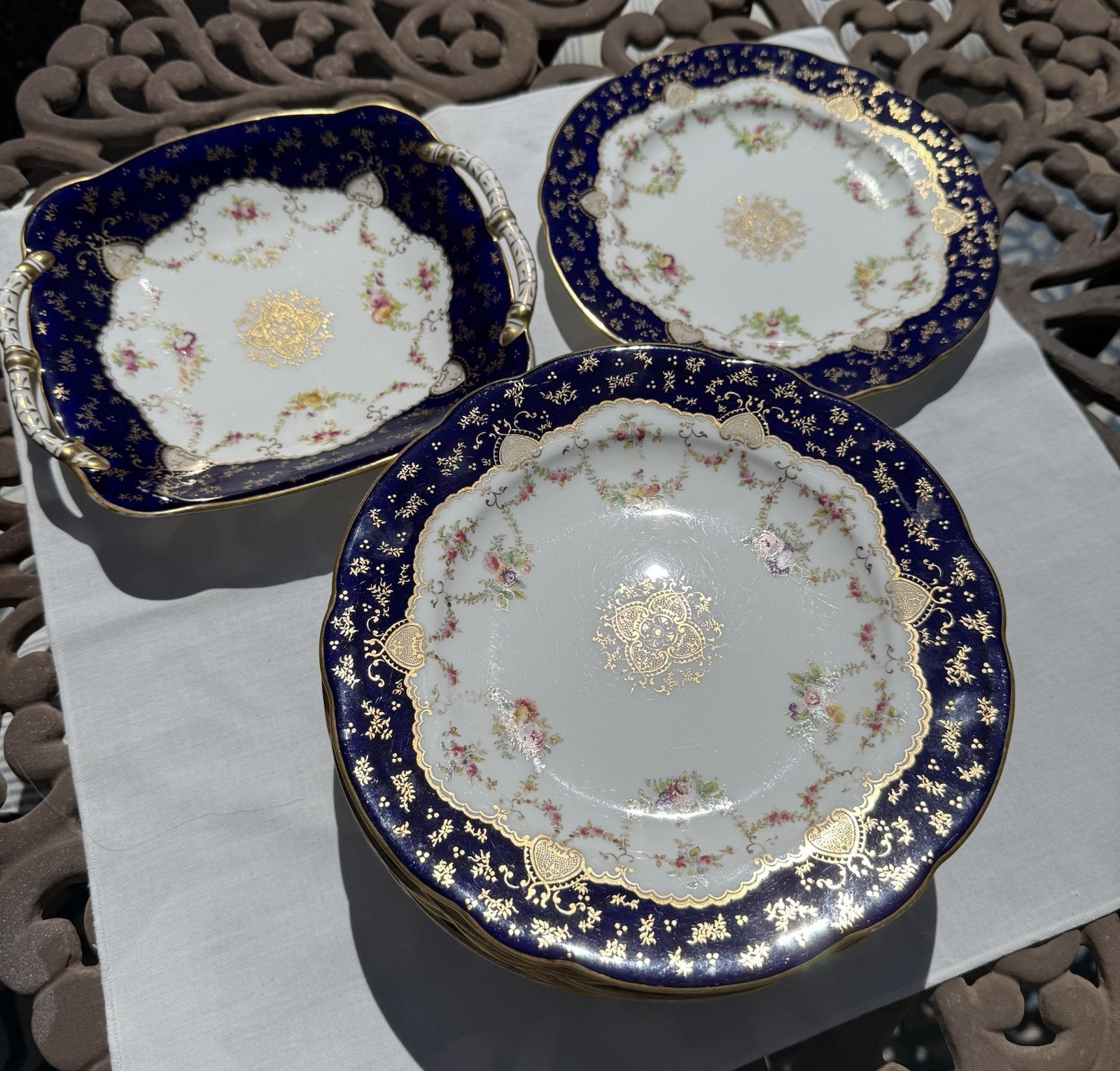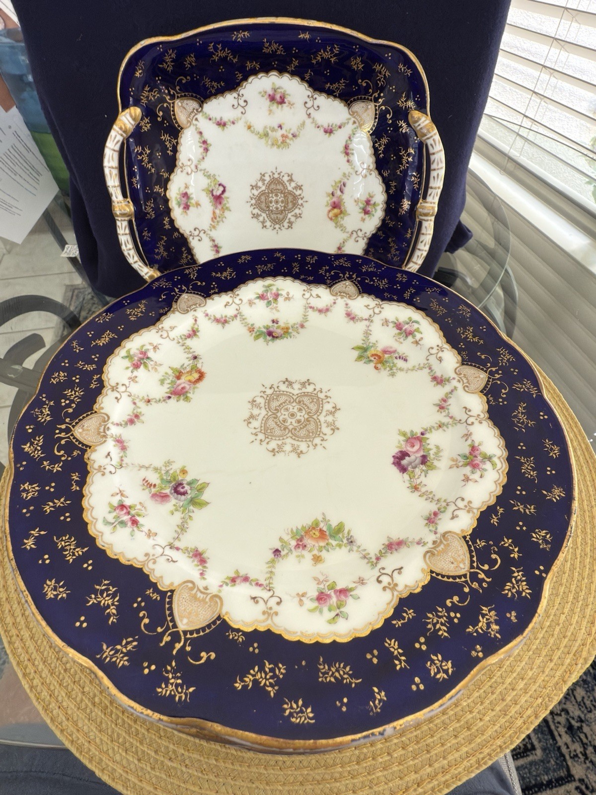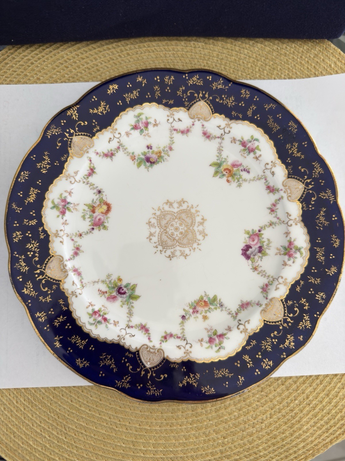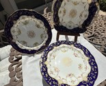 - Antique English COALPORT Porcelain 8 Cobalt blue dessert plates with Serving pl