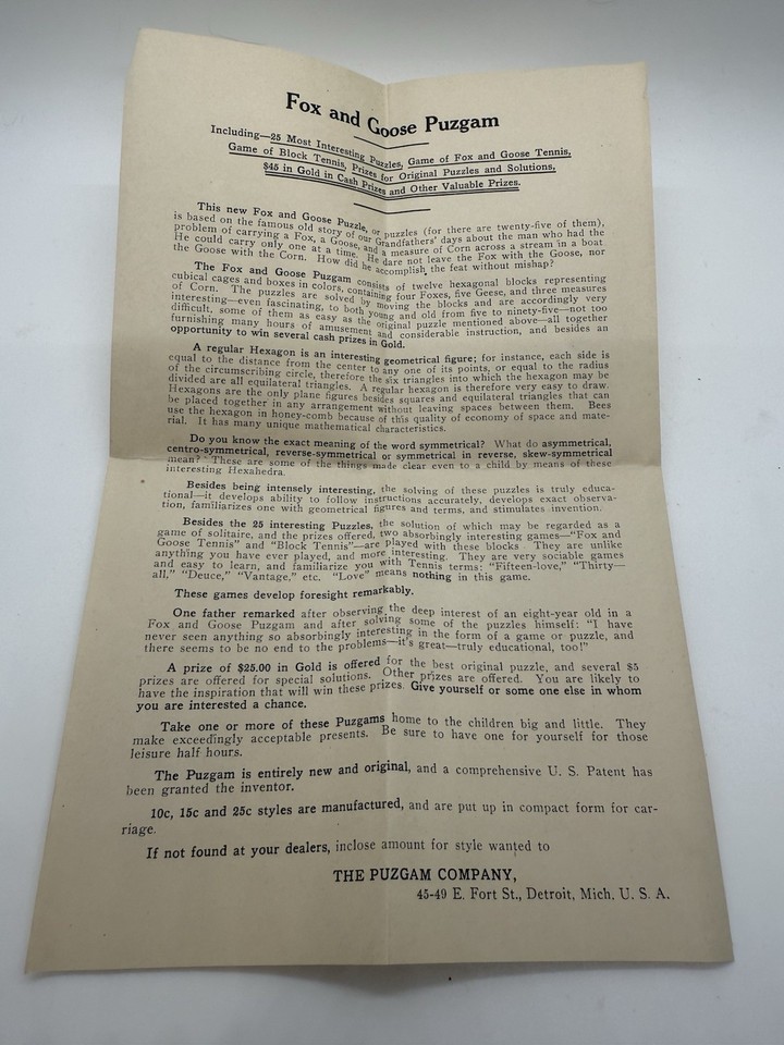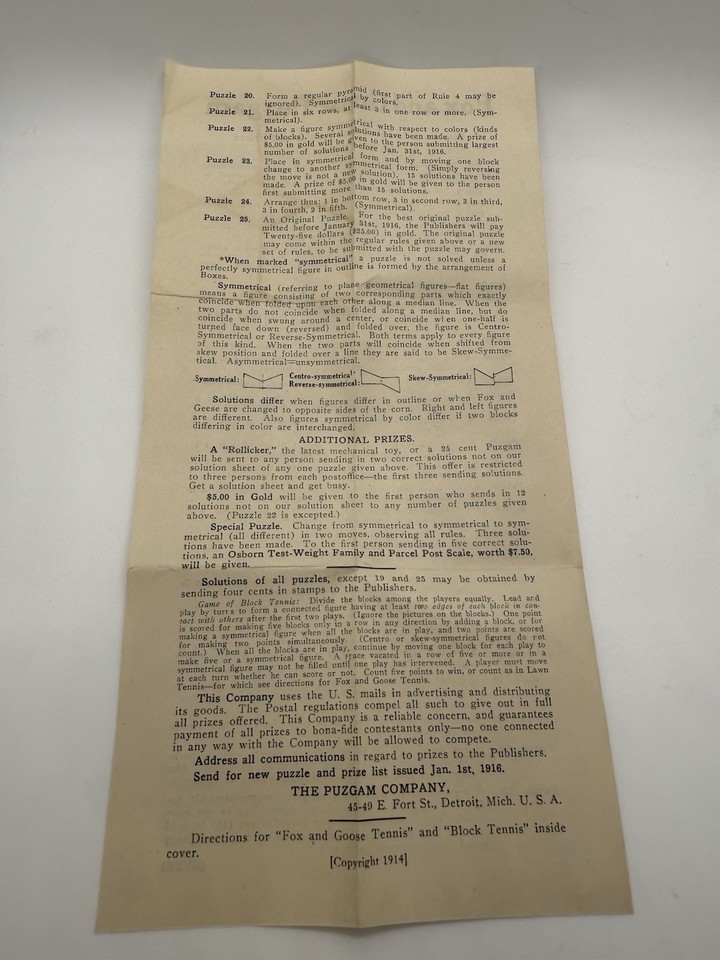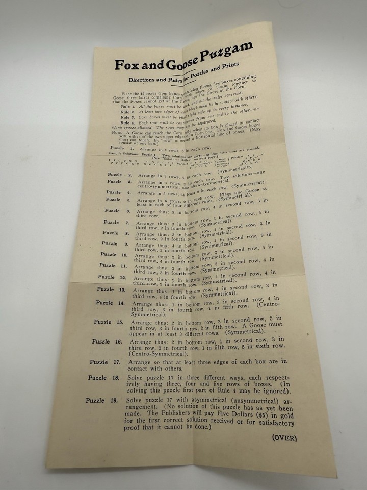 Step back into the early 20th century with this rare boxed parlor puzzle, Fox and Goose Puzgam, produced by The Puzgam Company of Detroit, Michigan. Combining puzzle-solving with competitive play, this clever game was patented in the early 1900s (c. 1914) and marketed as both an amusement and an educational toy.