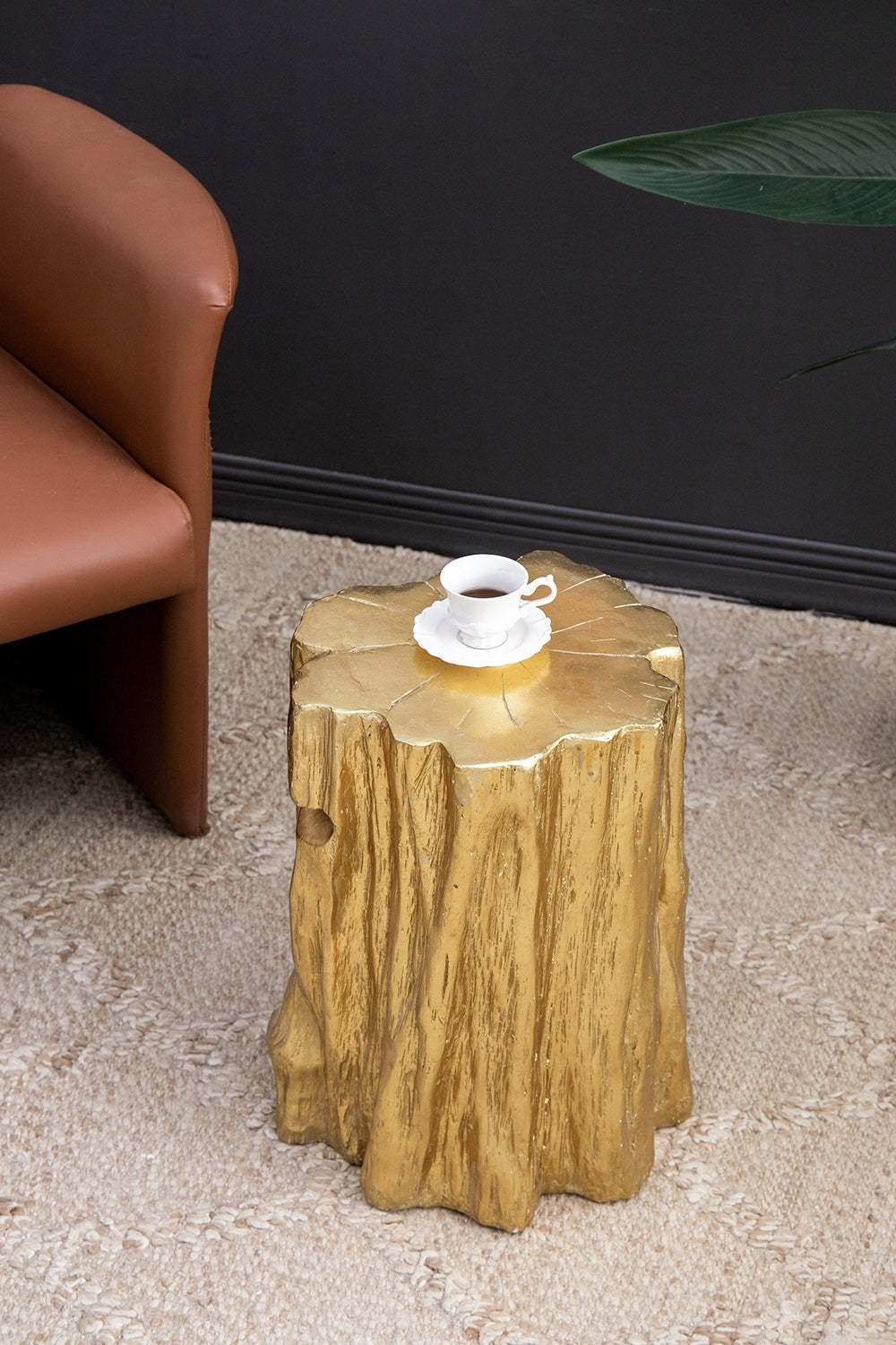 The Golden Tree Trunk Stool features the natural texture of real wood in a bright, modern gold finish for a chic look.
