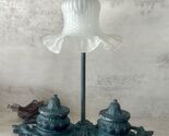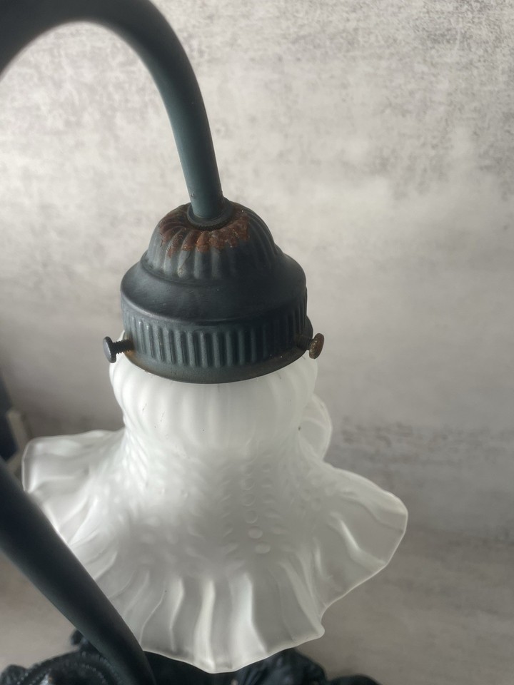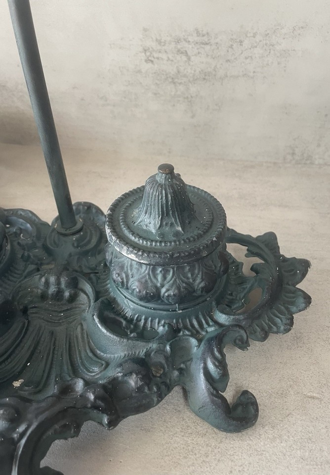 Beautiful antique Victorian desk lamp featuring a double inkwell base and marked ?BRITE METAL? on the underside. Ornate carved cast-metal body with claw-style legs, decorative scrollwork, and curved upright arm supporting a frosted ruffled glass shade. A striking display piece for vintage office decor, libraries, collectors, steampunk setups, or restoration projects. Details Style: Victorian / Antique Desk Lamp Feature: Double Inkwell Base Marking: BRITE METAL Shade: Frosted ruffled glass Material: Cast metal Color: Green finish Power: Electric/inline switch (tested working) Country/era: Unknown/early 1900s style