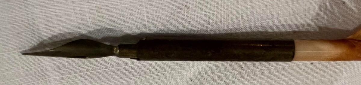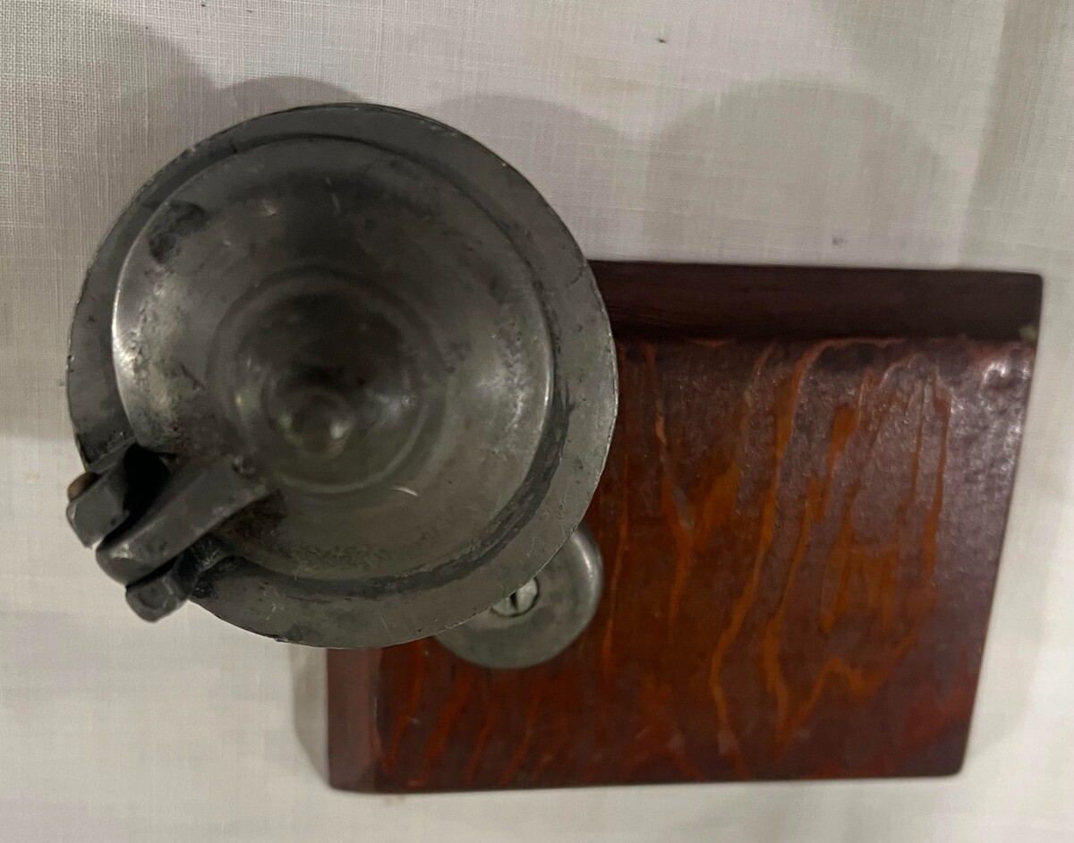 This is an antique ink well quill pen set. It is a vintage collectible featuring a classic design with a touch of elegance. Crafted from pewter, this set exudes a sense of nostalgia and charm. Perfect for adding a touch of historical flair to any desk or office space, this set is a must-have for collectors or those who appreciate timeless writing instruments. The ink well is mounted on a small piece of wood. It comes from a smoke-free and pet-free home.