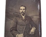 Antique Photo Tin Type History of America - Good Condition, Visible Wear See Photos ... This is an antique tintype photograph of a man seated in a studio setting. The subject, who has a dark mustache, is wearing a dark, three-button suit jacket, waistcoat, and a white shirt with a bow tie. He is seated with one arm resting on his lap and the other on a piece of furniture, possibly a chair arm or a small table. His posture is somewhat formal, and he looks directly at the camera with a serious expression.