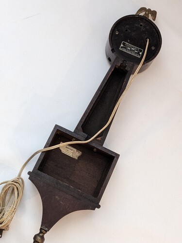 Cette horloge Seth Thomas Banjo Mansfield est une belle piece antique qui ajoutera du style et de la sophistication a n'importe quel espace. L'horloge est dotee d'un mouvement mecanique alimente par l'electricite. L'horloge est fabriquee en bois de haute qualite avec une finition en acajou, ce qui lui confere un aspect classique et elegant. L'horloge est concue en forme de banjo et a une couleur marron qui complete le style antique. L'horloge date de la periode 1920-1949 et constitue un excellent objet de collection pour les amateurs d'horloge. L'horloge est en excellent etat de fonctionnement et sera un excellent ajout a toute collection ou comme piece de decoration. Decoration metallique manquante de chaque cote.